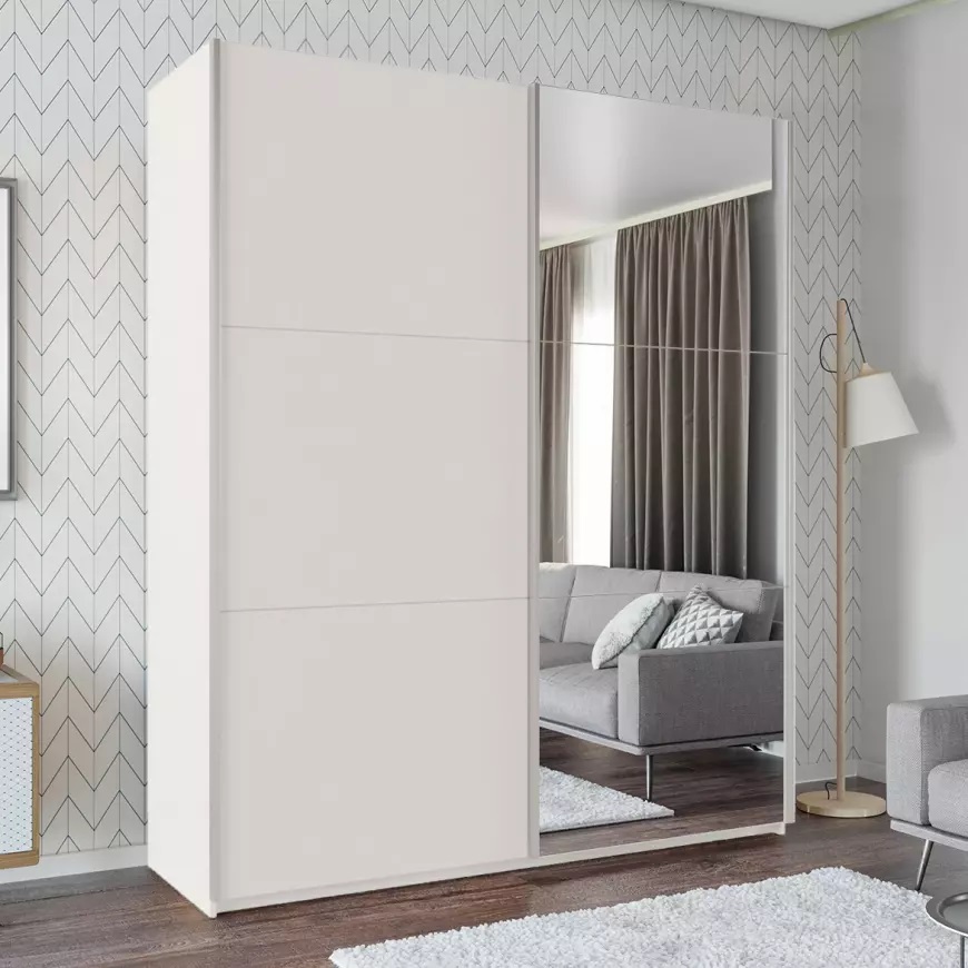 Szafa dwudrzwiowa z lustrem Rodos 200 to elegancki i funkcjonalny mebel, który doskonale sprawdzi się zarówno w sypialni, jak i w przedpokoju. Wykonana z wysokiej jakości płyty wiórowej laminowanej, szafa zapewnia trwałość i wytrzymałość. Jej klasyczny biały kolor oraz matowe wykończenie korpusu i frontów nadają jej nowoczesny i stylowy wygląd, który z łatwością wpasuje się w każde wnętrze, dodając mu świeżości i elegancji.