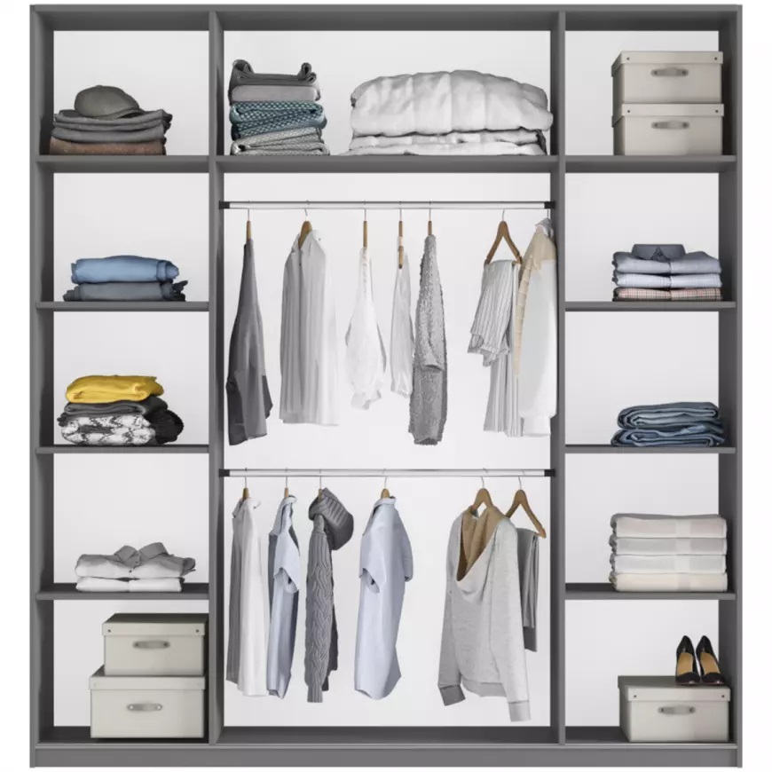 Wnętrze szafy Rodos 200 zostało zaprojektowane z myślą o wygodzie i funkcjonalności. Standardowe wyposażenie obejmuje dziewięć pojemnych półek, które umożliwiają przechowywanie różnych przedmiotów, od ubrań, przez akcesoria, aż po tekstylia domowe. Dodatkowo, dwa drążki na ubrania pozwalają na wygodne rozwieszenie koszul, sukienek czy płaszczy, co pomaga utrzymać porządek i organizację.