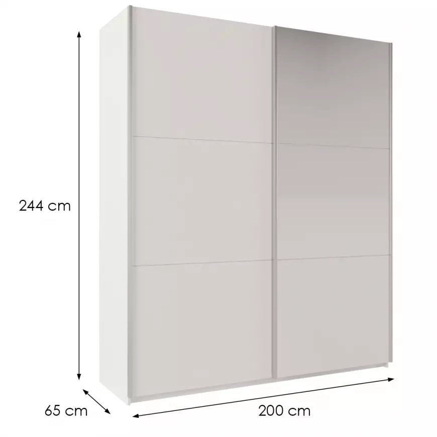 Szafa Rodos 200 charakteryzuje się przemyślaną konstrukcją, która umożliwia maksymalne wykorzystanie przestrzeni. Wyposażona w dwoje przesuwanych drzwi, zapewnia łatwy dostęp do wnętrza, a jednocześnie nie zajmuje dodatkowego miejsca, co jest szczególnie istotne w mniejszych pomieszczeniach. Na prawych drzwiach znajduje się duże lustro, które nie tylko pełni funkcję praktyczną, umożliwiając szybkie sprawdzenie wyglądu przed wyjściem z domu, ale również optycznie powiększa przestrzeń, czyniąc pokój bardziej przestronnym i jasnym.