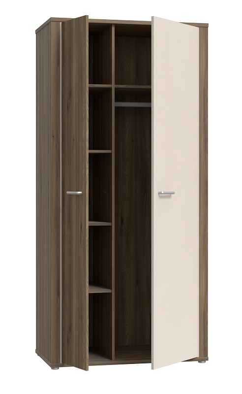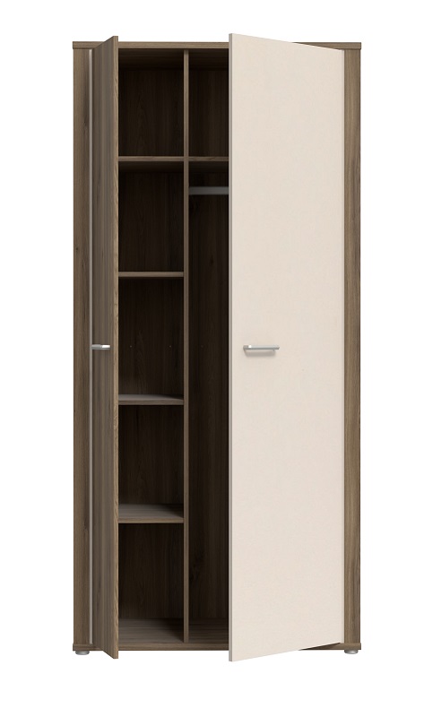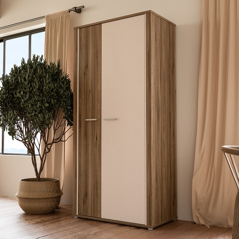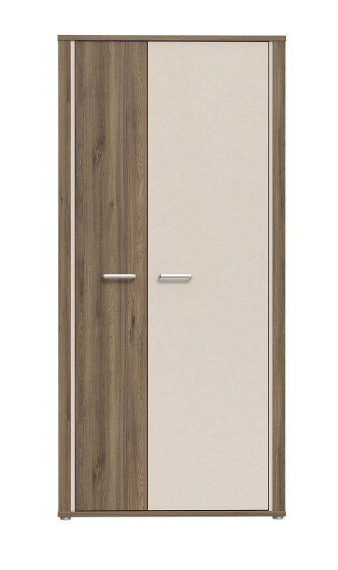 Fronty szafy w dwóch odcieniach - dębu valencia i piaskowym - tworzą harmonijny kontrast, który nadaje meblowi nowoczesnego wyglądu i pasuje do różnorodnych stylów aranżacyjnych. Dwudrzwiowa konstrukcja z drzwiami uchylnymi ułatwia dostęp do wnętrza, jednocześnie zapewniając estetyczny wygląd i ochronę przechowywanych przedmiotów.