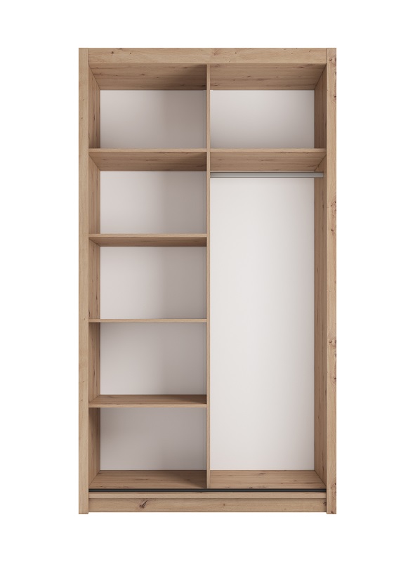 Wnętrze szafy Vesti 120 zostało starannie zaprojektowane, aby zapewnić maksymalną funkcjonalność. Pięć praktycznych półek oraz drążek na ubrania zapewniają dużo miejsca na przechowywanie odzieży, butów i akcesoriów, umożliwiając jednocześnie łatwy dostęp do wszystkich przechowywanych przedmiotów.