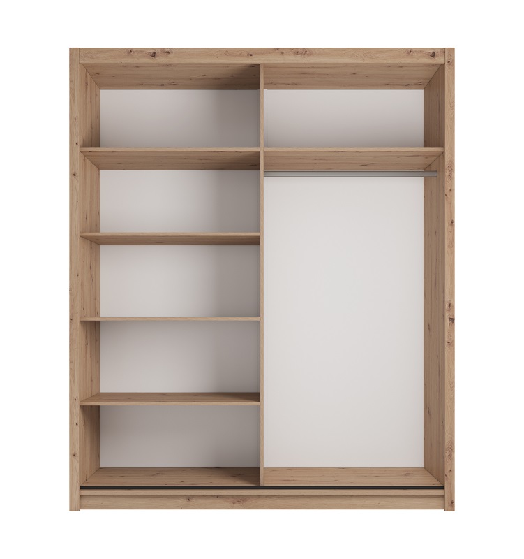 Wnętrze szafy zostało zaprojektowane z myślą o praktycznym przechowywaniu ubrań i akcesoriów. Znajdziesz w niej pięć wygodnych półek, na których możesz poukładać swoje rzeczy w porządku, oraz drążek na ubrania, idealny do zawieszenia koszul, marynarek czy sukienek. Dzięki temu wszystkie ubrania będą dobrze zorganizowane i łatwo dostępne.