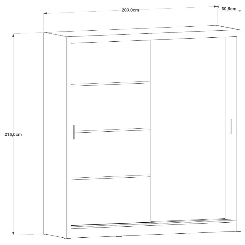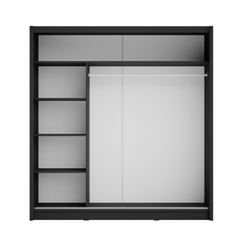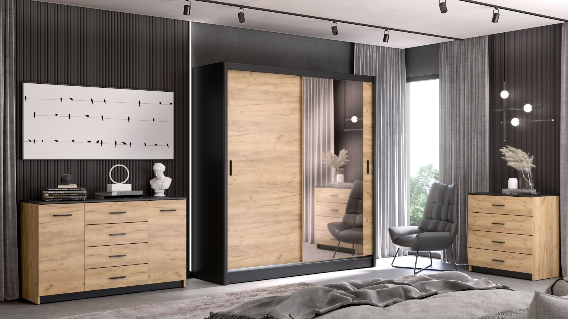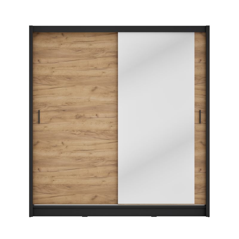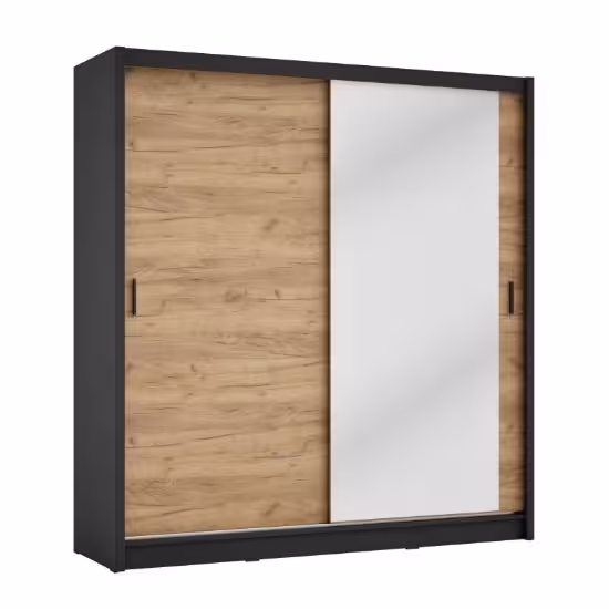 Szafa Alfa to nowoczesna i funkcjonalna szafa przesuwna w kolorze czarny/dąb craft z lustrem i stylowymi czarnymi plastikowymi uchwytami. Wysokiej jakości fronty w kolorze dąb craft nadadzą pomieszczeniu cieplej, naturalnej tonacji a wysokie lustro optycznie powiększy przestrzeń. Aluminiowe tory w drzwiach i łożyskowane okucia gwarantują wysoki komfort uzytkowania i zwiększoną trwałość konstrukcji. Praktyczne wnętrze wyposażone w 3 półki i drążek na ubrania pozwoli na wygodne organizacje przestrzeni. Dzięki przemyślanej konstrukcji szafa pomieści wszystko, co potrzebne – od odzieży po dodatki, zachowując przy tym porządek i estetykę, czyniąc ją idealnym wyborem do garderoby, sypialni lub przedpokoju.