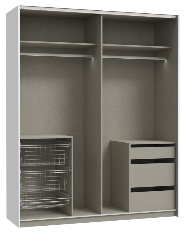 Wnętrze szafy Ossett 170 wykonane jest w eleganckim kolorze szarym imitującym materiał, co nadaje jej nowoczesny i stylowy wygląd. Standardowe wyposażenie szafy obejmuje jedną stałą półkę oraz drążek na ubrania, co umożliwia wygodne i uporządkowane przechowywanie odzieży.