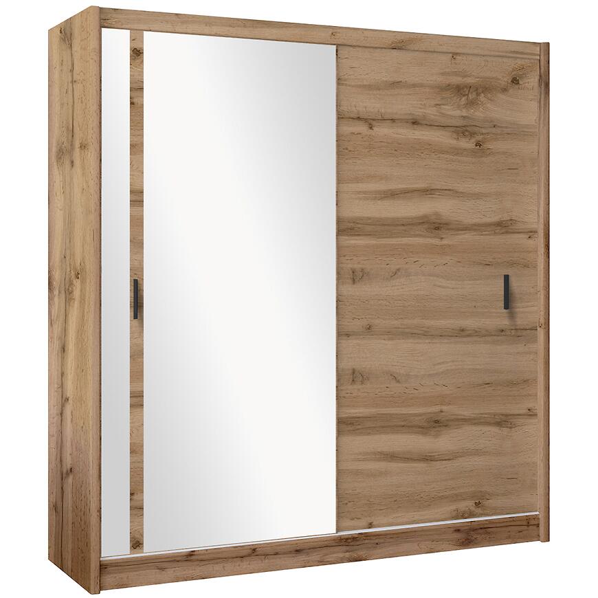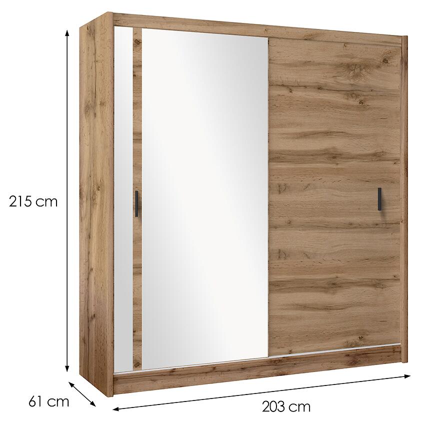 Szafa przesuwna 203 cm z lustrem to propozycja dla osób, które szukają pojemnej szafy do sypialni w kolorze dąb wotan, łączącej funkcję przechowywania z praktycznym lustrem. Przemyślany podział wnętrza, trwała konstrukcja z płyty laminowanej oraz system drzwi przesuwnych sprawiają, że mebel odpowiada na realne potrzeby codziennego użytkowania.