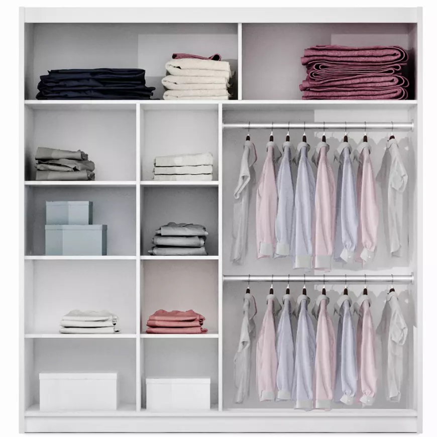 Matowe wykończenie korpusu i frontów nadaje szafie nowoczesny i subtelny wygląd, a jednocześnie ułatwia utrzymanie jej w czystości. Szafa Vista 203 to szafa dwudrzwiowa z drzwiami przesuwnymi, co jest niezwykle praktyczne, szczególnie w pomieszczeniach o ograniczonej przestrzeni. Drzwi przesuwne nie tylko oszczędzają miejsce, ale także zapewniają łatwy dostęp do zawartości szafy.