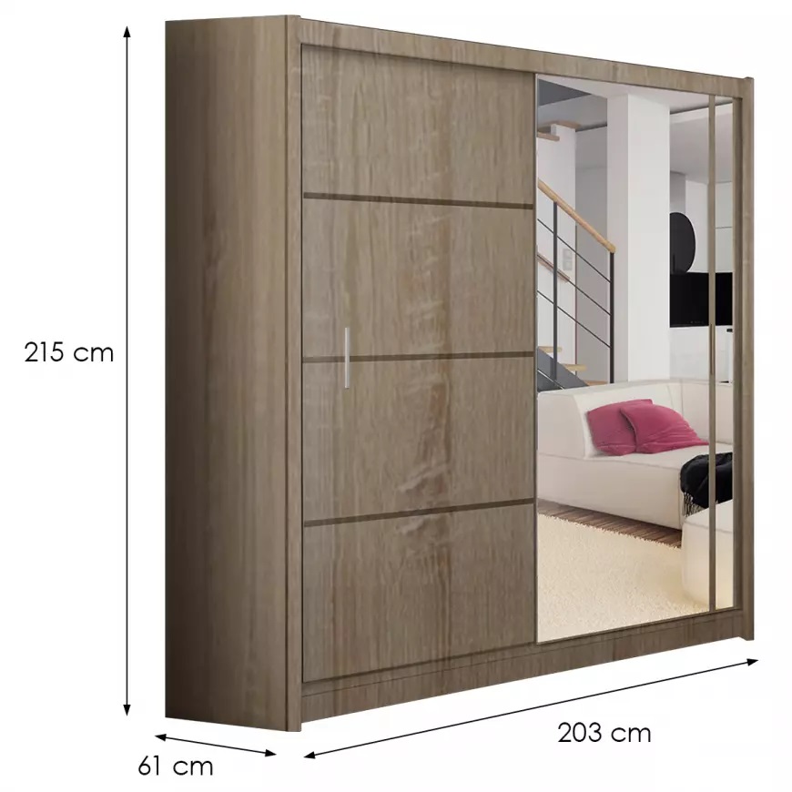 Na prawych drzwiach szafy umieszczono duże lustro, które pełni nie tylko funkcję praktyczną, umożliwiając wygodne przeglądanie się, ale także optycznie powiększa pomieszczenie, dodając mu przestronności i jasności. Dzięki szerokości 203 cm i głębokości 61 cm, szafa oferuje wyjątkowo dużą przestrzeń do przechowywania, co pozwala na wygodne uporządkowanie ubrań i akcesoriów.
