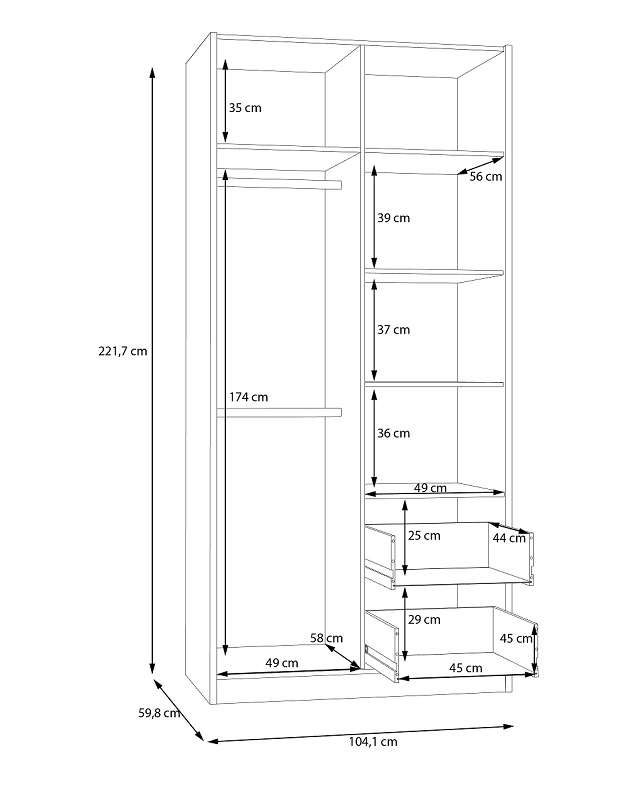 Szafa Coxim CXMS921L została zaprojektowana z myślą o maksymalnej funkcjonalności. Wyposażona w dwa drążki na ubrania, oferuje dużo miejsca na przechowywanie ubrań wiszących, takich jak koszule, sukienki czy kurtki. Cztery pojemne półki pozwalają na uporządkowanie pozostałych elementów garderoby, takich jak swetry, jeansy czy akcesoria. Dzięki dobrze przemyślanej konstrukcji, każdy element garderoby znajdzie swoje miejsce, co ułatwia utrzymanie porządku i organizację przestrzeni.