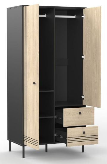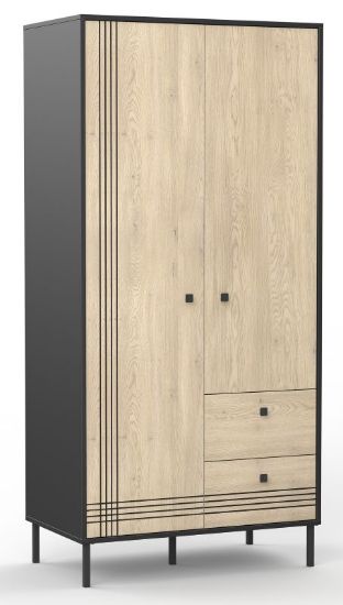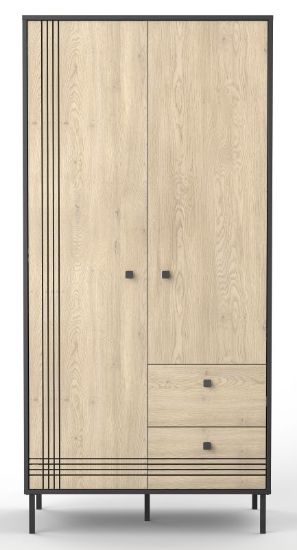Szafa dwudrzwiowa Quel typ 1 to idealne rozwiązanie dla osób poszukujących funkcjonalnego i stylowego miejsca do przechowywania ubrań. Wyposażona w drążek na ubrania, cztery praktyczne półki oraz dwie pojemne szuflady, zapewnia wygodne rozmieszczenie garderoby i akcesoriów.