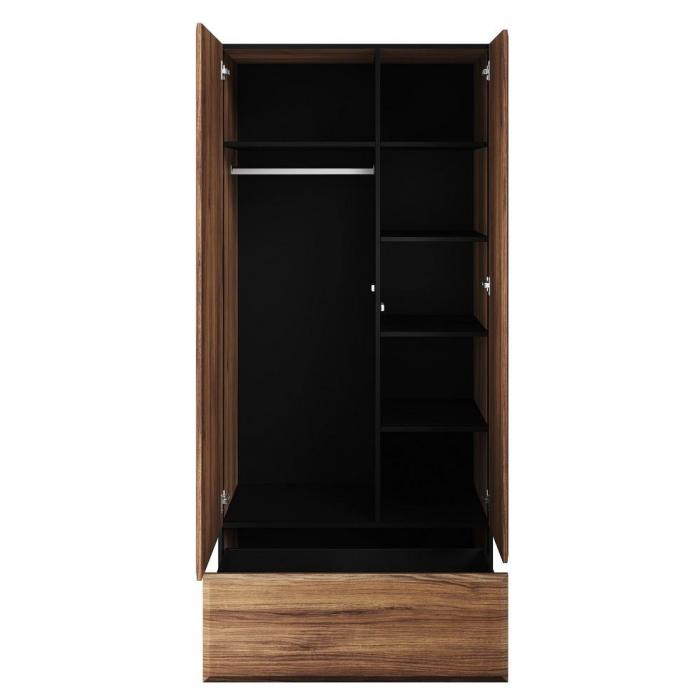 Elegancka szafa dwudrzwiowa z uchylnymi drzwiami w stylu nowoczesnej elegancji. Mebel wspiera się na lekkich, bardzo smukłych nóżkach. Połączenie czerni z dekorem w kolorze ciemnego drewna prezentuje się modnie, stylowo, a jednocześnie wprowadza do wnętrza dużo przytulnego ciepła. Charakterystyczne, bezuchwytowe fronty z nietypowo frezowanymi krawędziami wykonano z wytrzymałej płyty MDF. O komfortowe zamykanie i otwieranie zadbał system pusch to open.