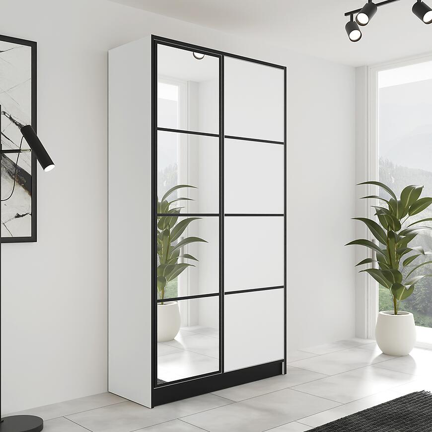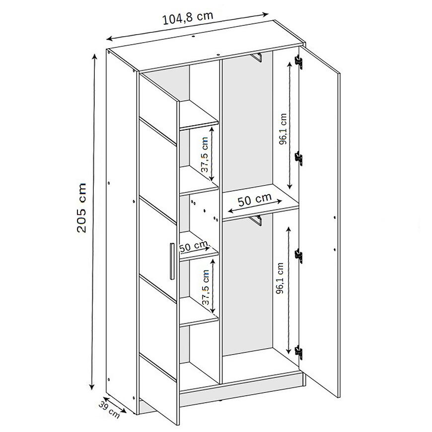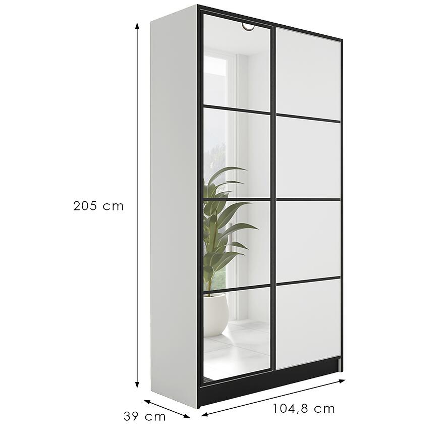 Szafa Eden 2d 107 Biały to nowoczesny i funkcjonalny mebel, łączący elegancję z praktycznym designem. Posiada dwudrzwiową konstrukcję z klasycznymi drzwiami oraz lustrem na froncie, które zwiększa użyteczność i optycznie powiększa przestrzeń. Wykonana z laminowanej płyty wiórowej w białym, matowym wykończeniu, łączy trwałość z estetyką. Dzięki wymiarom 104,8 × 205 × 39 cm zapewnia przestronne przechowywanie przy zachowaniu nowoczesnej, smukłej formy.