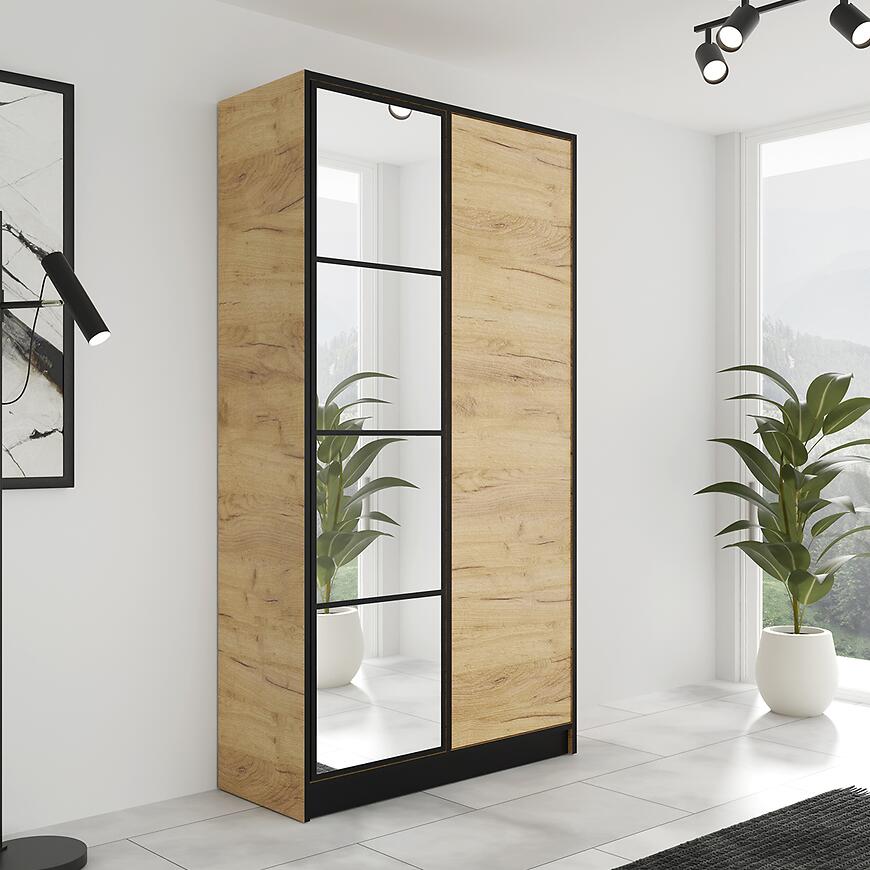 Szafa Eden 2d 107 Dąb Craft Złoty to nowoczesny i funkcjonalny mebel, łączący elegancję z praktycznym designem. Posiada dwudrzwiową konstrukcję z klasycznymi drzwiami oraz lustrem na froncie, które zwiększa użyteczność i optycznie powiększa przestrzeń. Wykonana z laminowanej płyty wiórowej w jasnym, drewnopodobnym wykończeniu matowym, łączy trwałość z estetyką. Dzięki wymiarom 104,8 × 205 × 39 cm zapewnia przestronne przechowywanie przy zachowaniu nowoczesnej, smukłej formy.