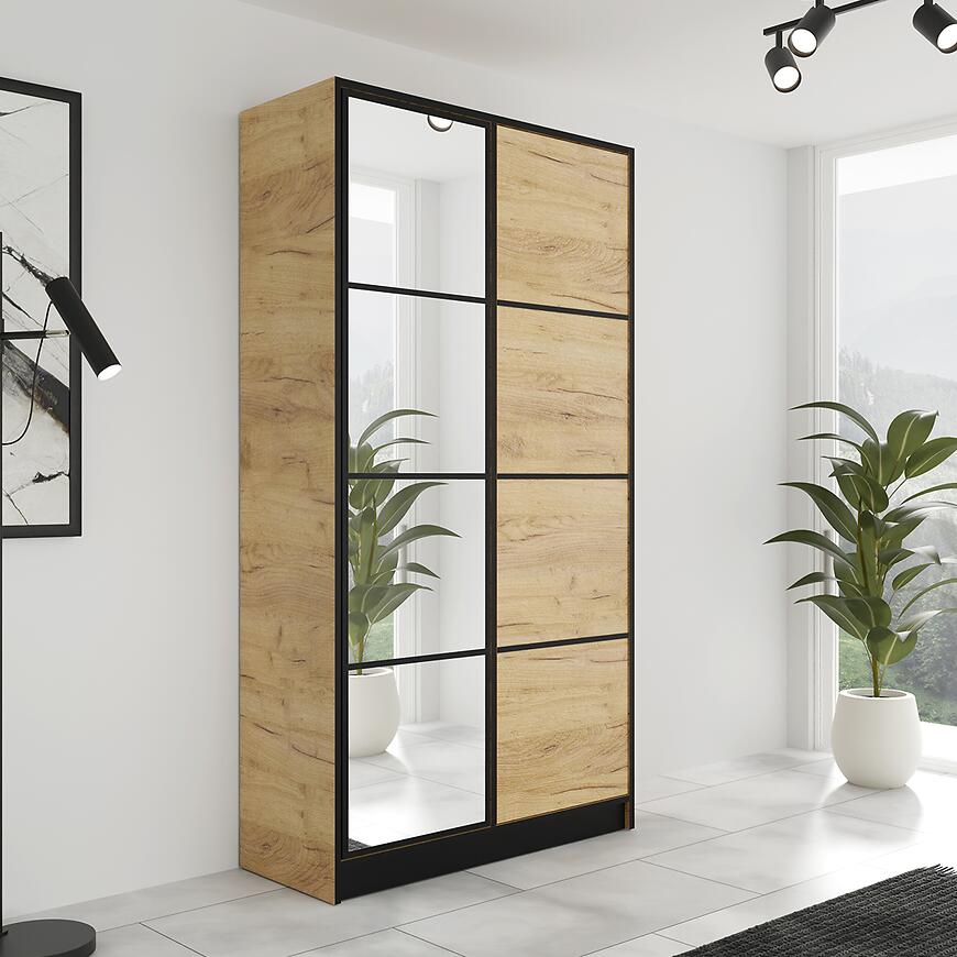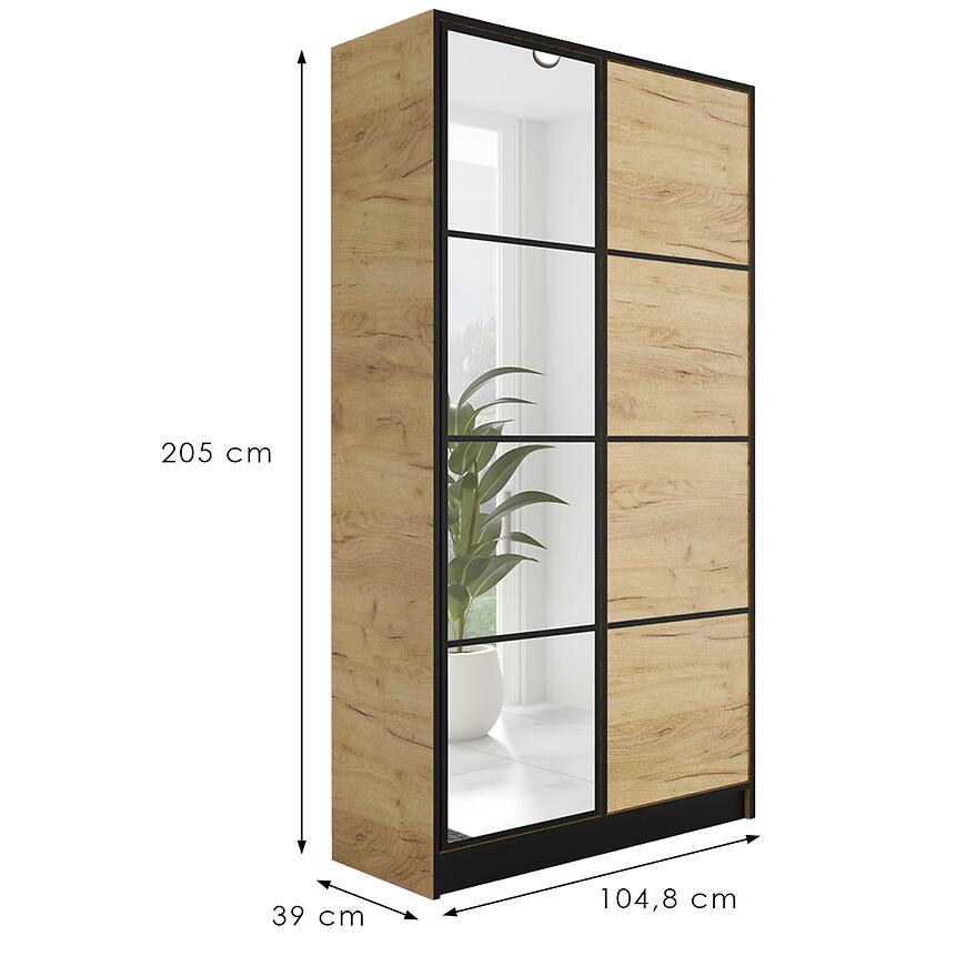 Szafa Eden 2d 107 Dąb Craft Złoty to nowoczesny i funkcjonalny mebel, łączący elegancję z praktycznym designem. Posiada dwudrzwiową konstrukcję z klasycznymi drzwiami oraz lustrem na froncie, które zwiększa użyteczność i optycznie powiększa przestrzeń. Wykonana z laminowanej płyty wiórowej w jasnym, drewnopodobnym wykończeniu matowym, łączy trwałość z estetyką. Dzięki wymiarom 104,8 × 205 × 39 cm zapewnia przestronne przechowywanie przy zachowaniu nowoczesnej, smukłej formy.