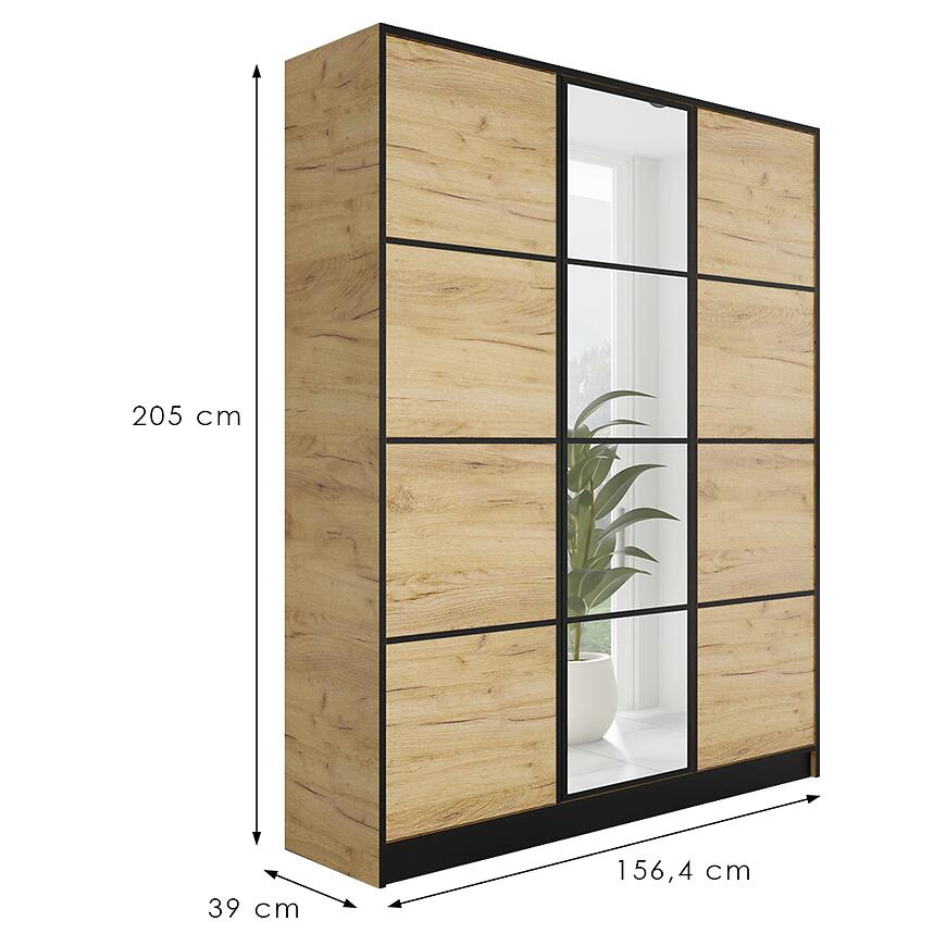 Szafa Eden 3d 157 Dąb Craft Złoty to nowoczesny i funkcjonalny mebel, łączący elegancję z praktycznym designem. Posiada trzydrzwiową konstrukcję z klasycznymi drzwiami oraz lustrem na froncie, które zwiększa użyteczność i optycznie powiększa przestrzeń. Wykonana z laminowanej płyty wiórowej w jasnym, drewnopodobnym wykończeniu matowym, łączy trwałość z estetyką. Dzięki wymiarom 156,4 × 205 × 39 cm zapewnia przestronne przechowywanie przy zachowaniu nowoczesnej, smukłej formy.