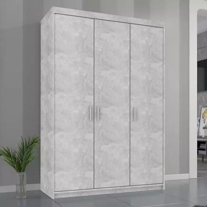Szafa Elena w kolorze szary beton, wykończenie matowe. Klasyczna szafa trzydrzwiowa z drążkiem na ubrania wiszące oraz półkami. Drzwi uchylne.