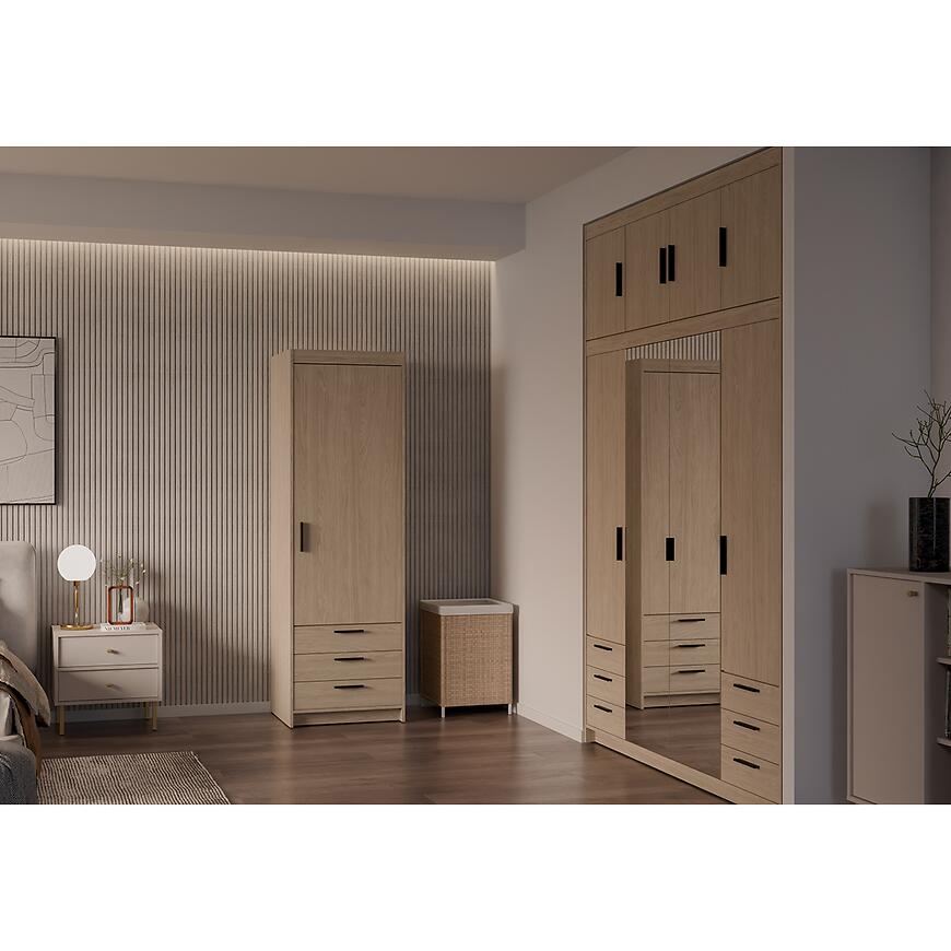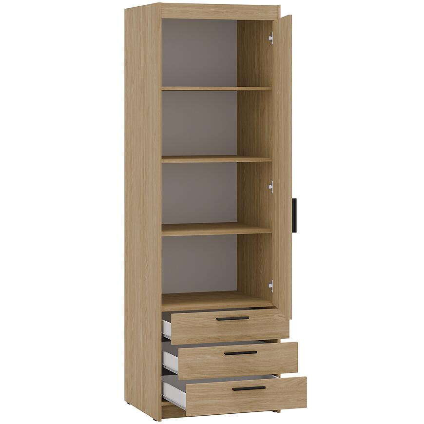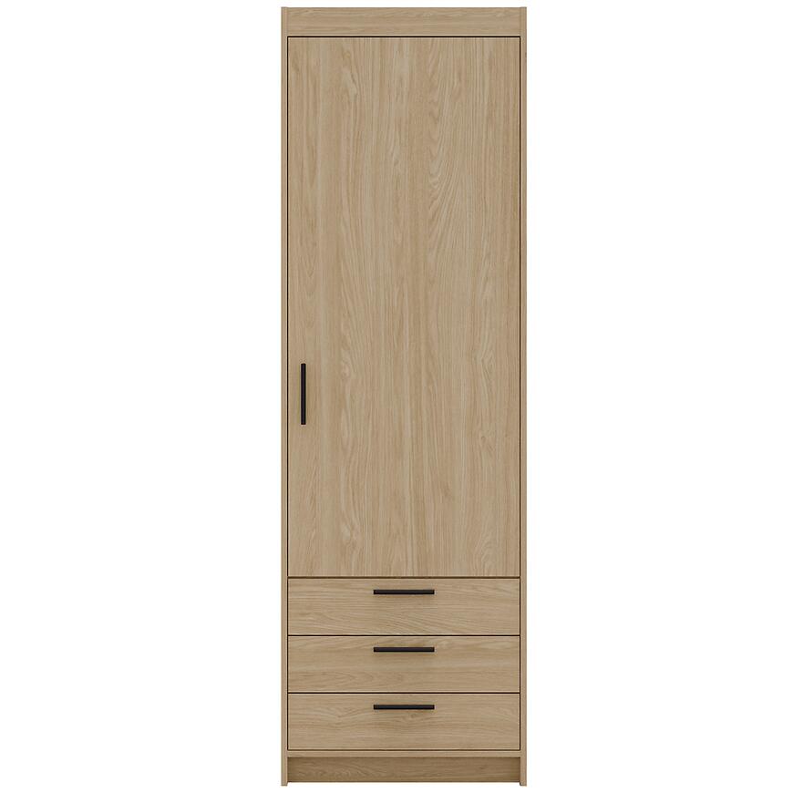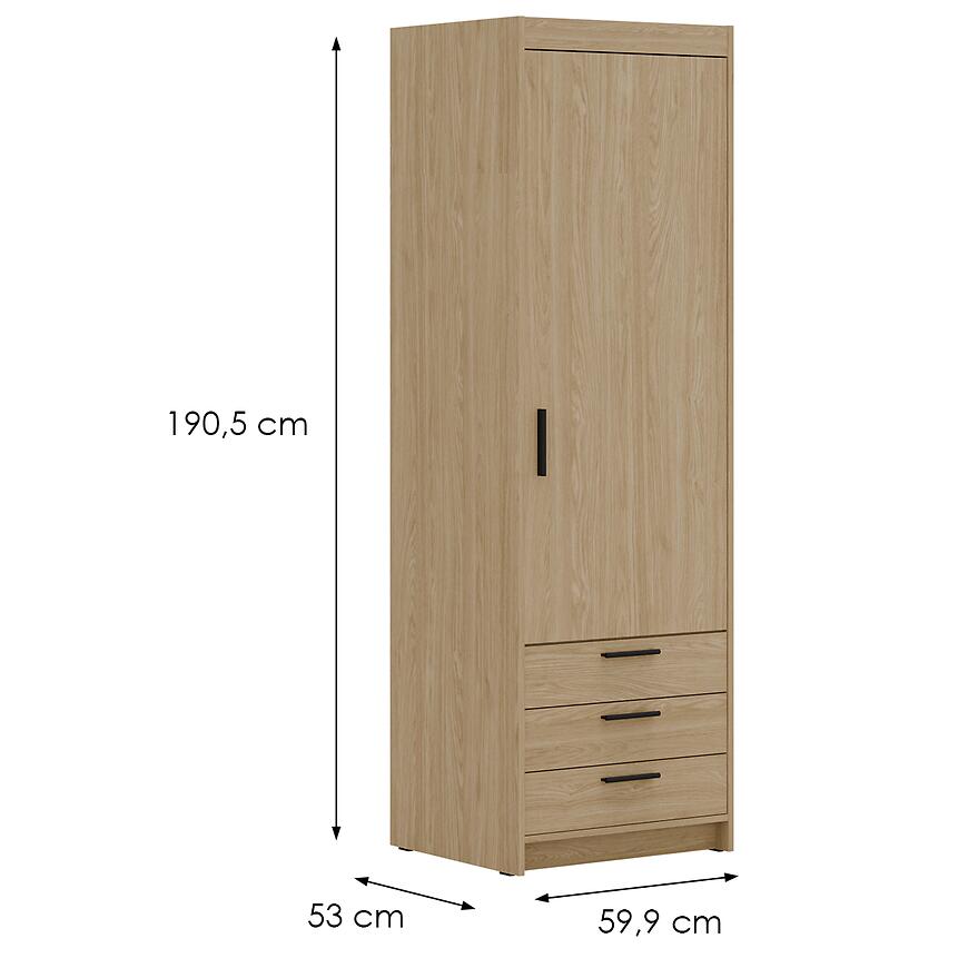 Jednodrzwiowa konstrukcja o szerokości 59,9 cm, wysokości 190,5 cm i głębokości 53 cm zapewnia wygodne przechowywanie odzieży i tekstyliów. Trzy praktyczne szuflady umożliwiają segregację drobnych elementów garderoby i ułatwiają utrzymanie porządku w codziennym użytkowaniu.