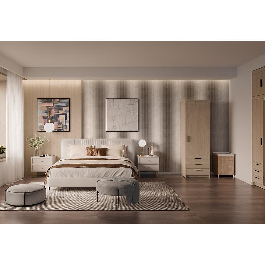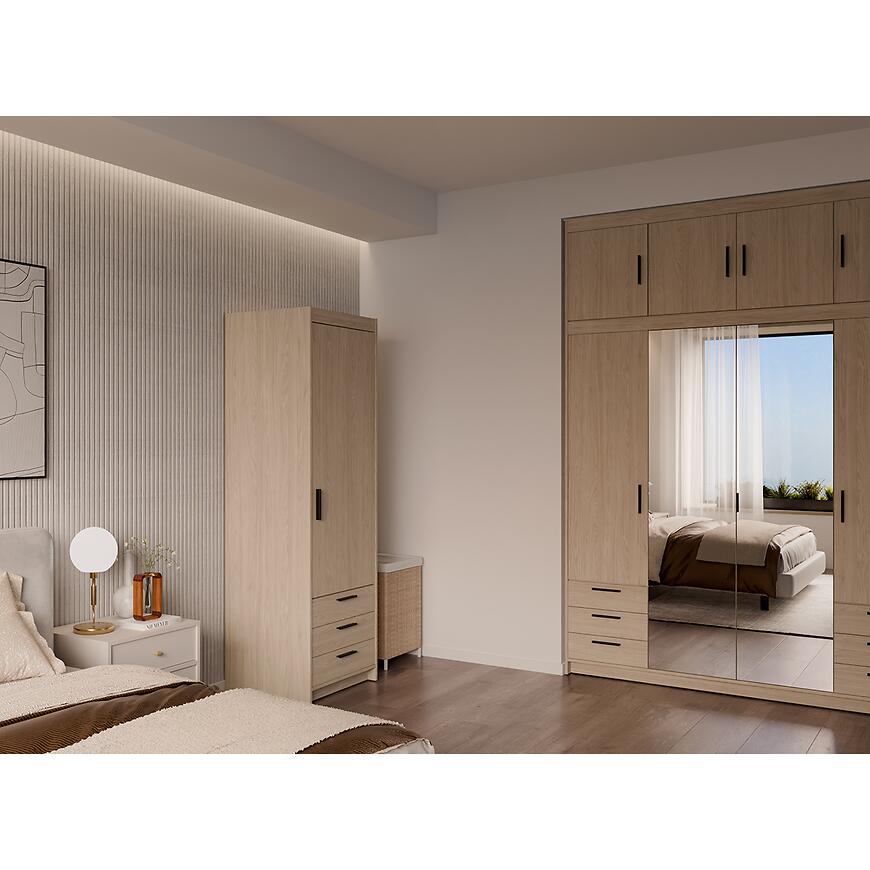 Szafa Elena 1D 3S należy do kolekcji ELENA, łączącej nowoczesny styl z praktycznymi rozwiązaniami do przechowywania. Fronty i korpus wykonano z laminowanej płyty wiórowej, co zapewnia trwałość i odporność na codzienne użytkowanie. Matowe wykończenie frontów podkreśla naturalny charakter drewna i ogranicza widoczność odcisków palców, nadając szafie elegancki wygląd.
