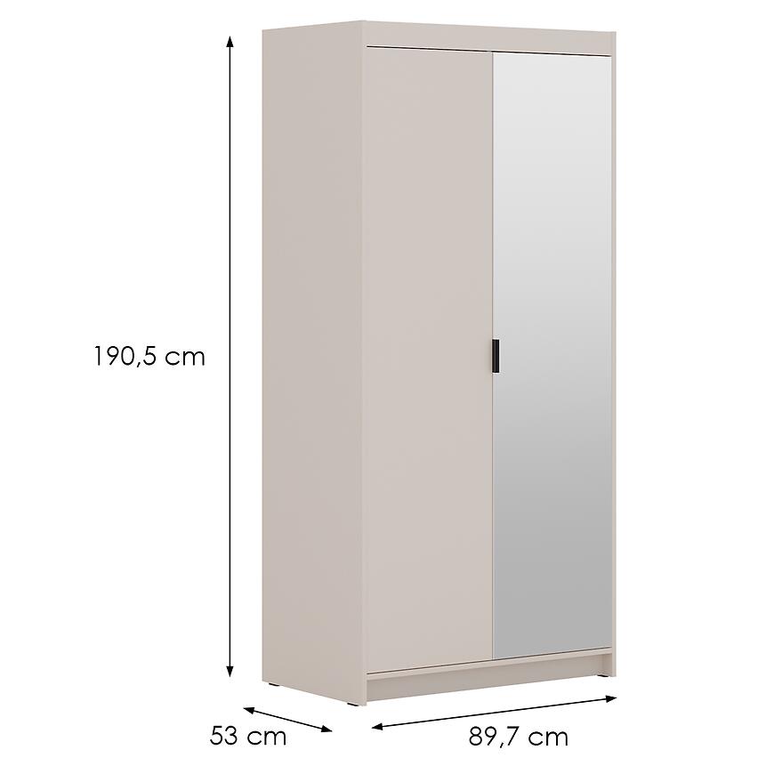 Wbudowane lustro na jednym z frontów pełni praktyczną funkcję i jednocześnie optycznie powiększa przestrzeń, co czyni tę szafę doskonałym wyborem do sypialni, przedpokoju lub mniejszej garderoby. Wymiary 89,7 cm szerokości, 190,5 cm wysokości oraz 53 cm głębokości pozwalają na wygodne przechowywanie odzieży przy zachowaniu kompaktowej formy mebla.