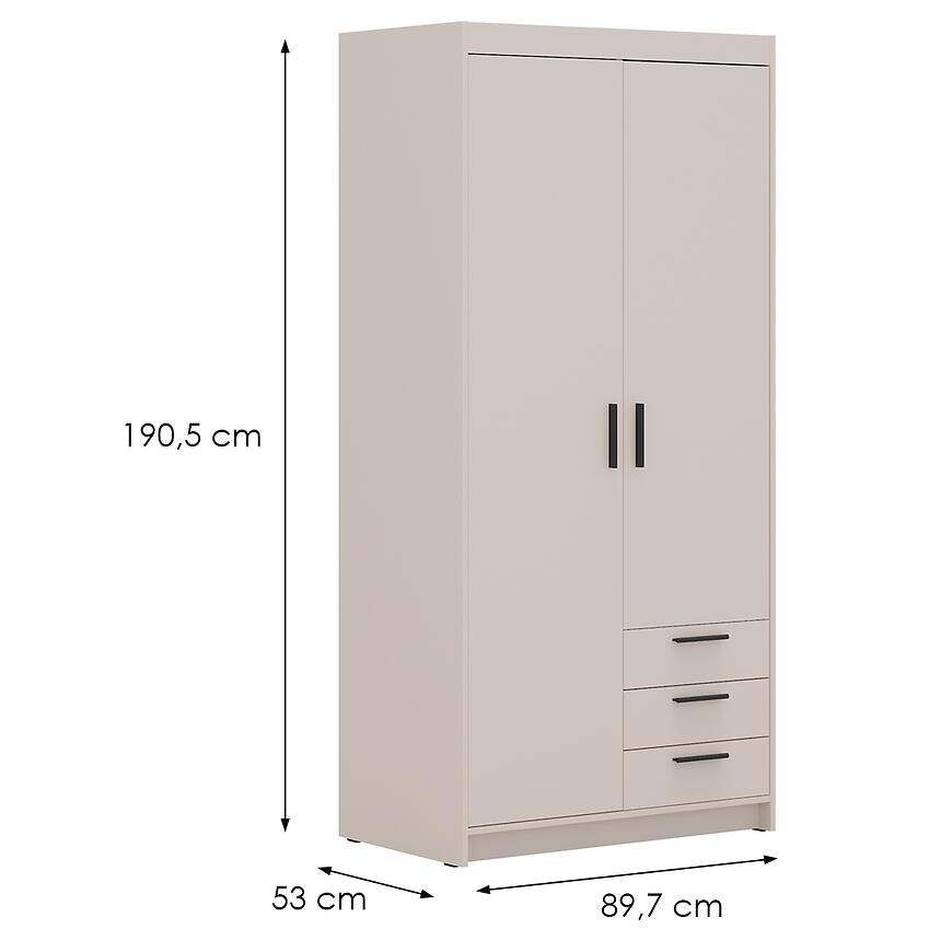 Dwudrzwiowa konstrukcja szafy o szerokości 89,7 cm, wysokości 190,5 cm i głębokości 53 cm zapewnia wygodne przechowywanie ubrań i tekstyliów, a trzy praktyczne szuflady pozwalają na segregację drobniejszych elementów garderoby. Dzięki temu szafa Elena 2D 3S pomaga utrzymać porządek i organizację w codziennym użytkowaniu.