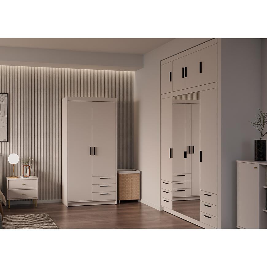 Szafa Elena 2D 3S w kolorze beż piaskowy to funkcjonalny mebel do nowoczesnych wnętrz, który łączy pojemność z eleganckim designem. Jej prosta, geometryczna forma oraz matowe wykończenie frontów nadają lekkości i estetyki, a neutralny beż wprowadza do pomieszczenia spokój i harmonijną atmosferę.