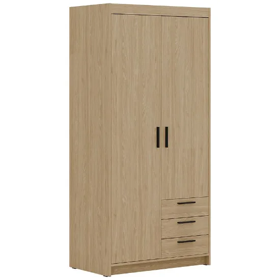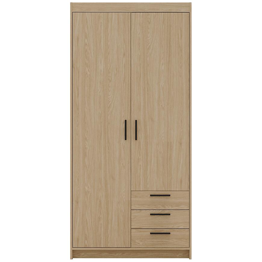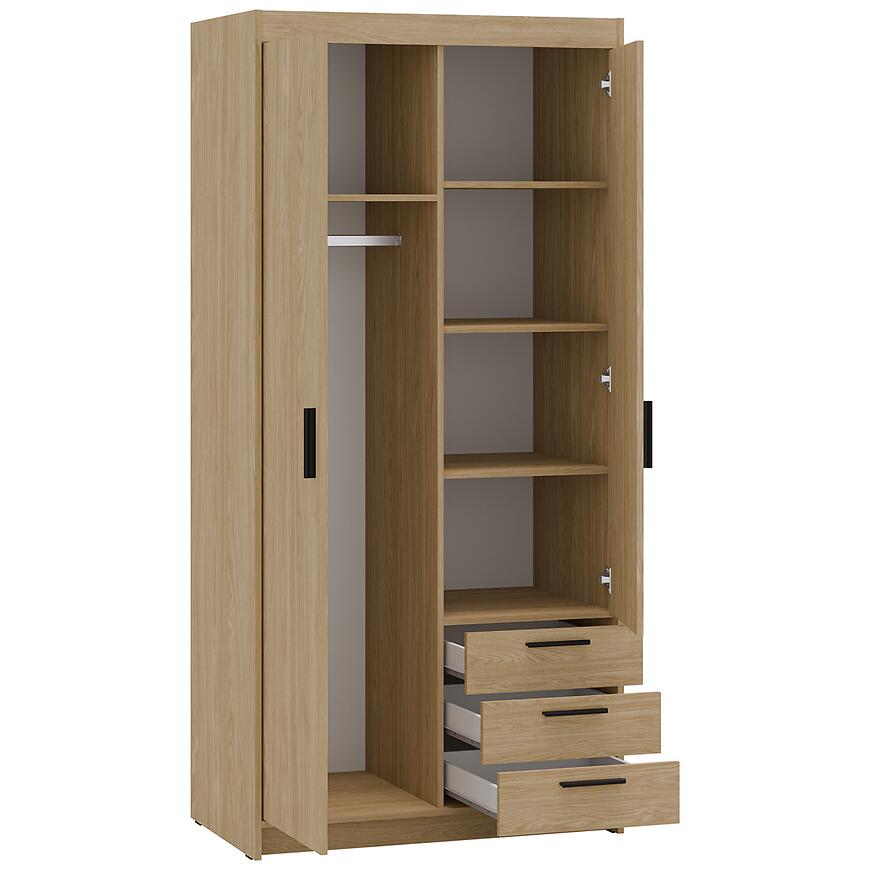 Klasyczne drzwi dwudrzwiowe ułatwiają dostęp do wnętrza szafy, a trzy szuflady pozwalają wygodnie przechowywać drobne akcesoria, bieliznę lub dodatki garderobiane.