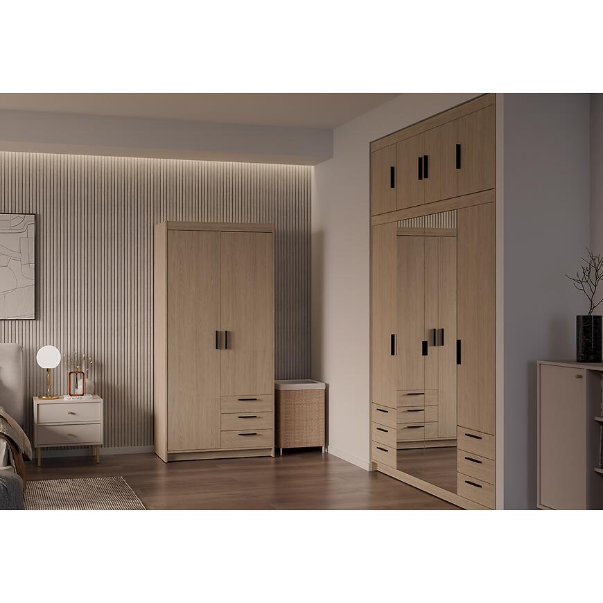Szafa Elena 2D 3S w kolorze dąb olejowany łączy nowoczesny design z praktycznym przechowywaniem. Jej prosta, geometryczna forma oraz matowe wykończenie frontów nadają szafie lekkości i elegancji, a ciepły, drewnopodobny odcień wprowadza naturalny, przytulny charakter do sypialni, garderoby lub przedpokoju.