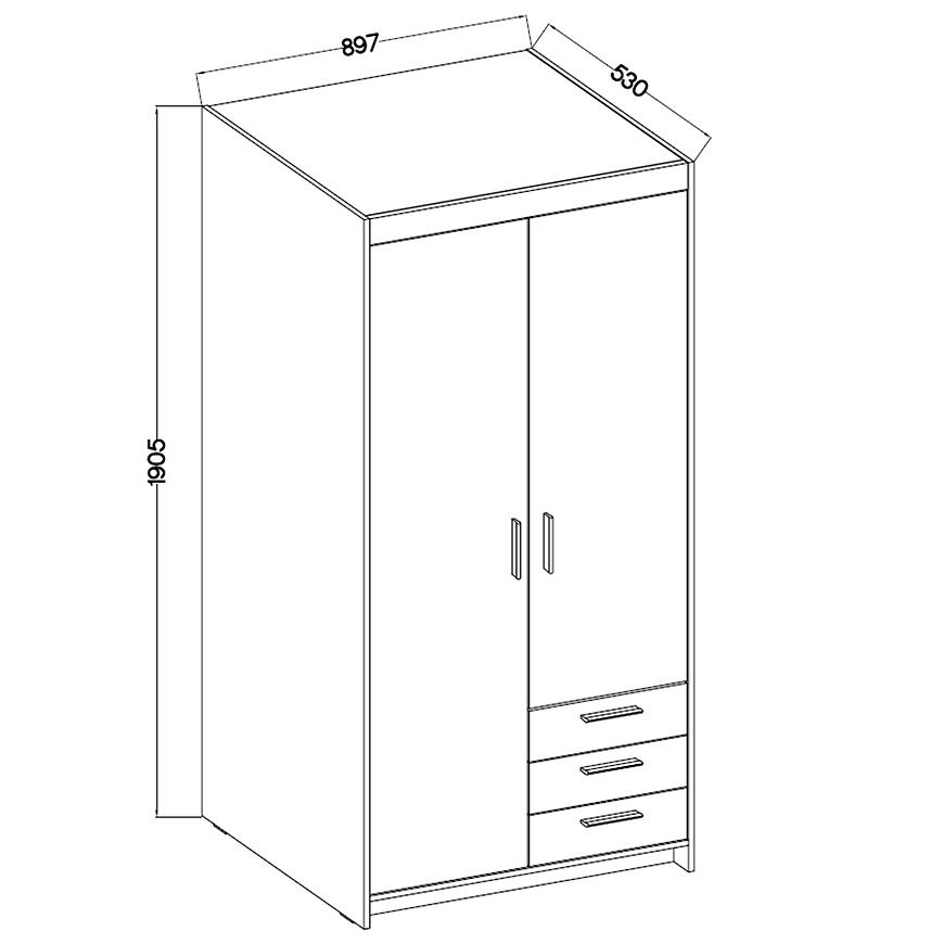 Dwudrzwiowa konstrukcja o szerokości 89,7 cm, wysokości 190,5 cm i głębokości 53 cm zapewnia wygodne przechowywanie ubrań, pościeli i tekstyliów. Trzy praktyczne szuflady umożliwiają segregację drobniejszych elementów garderoby i pomagają utrzymać porządek na co dzień.