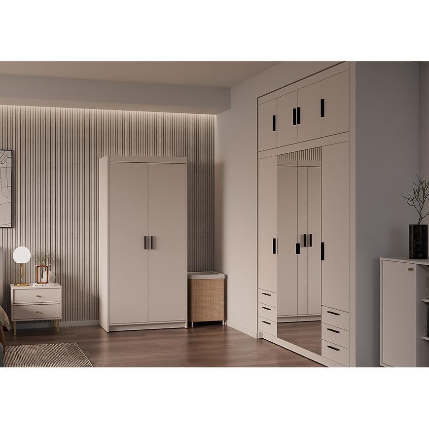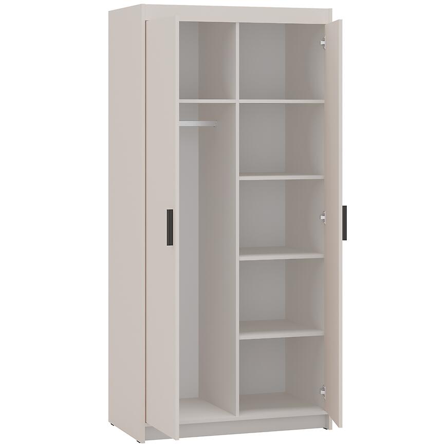 Beżowa szafa dwudrzwiowa Elena to uniwersalny mebel, który sprawdzi się w różnych przestrzeniach. Może pełnić funkcję szafy do sypialni, szafy do przedpokoju lub uzupełnienia garderoby. Jej kompaktowa głębokość 53 cm pozwala na ustawienie nawet w węższych pomieszczeniach, bez rezygnacji z miejsca do przechowywania.