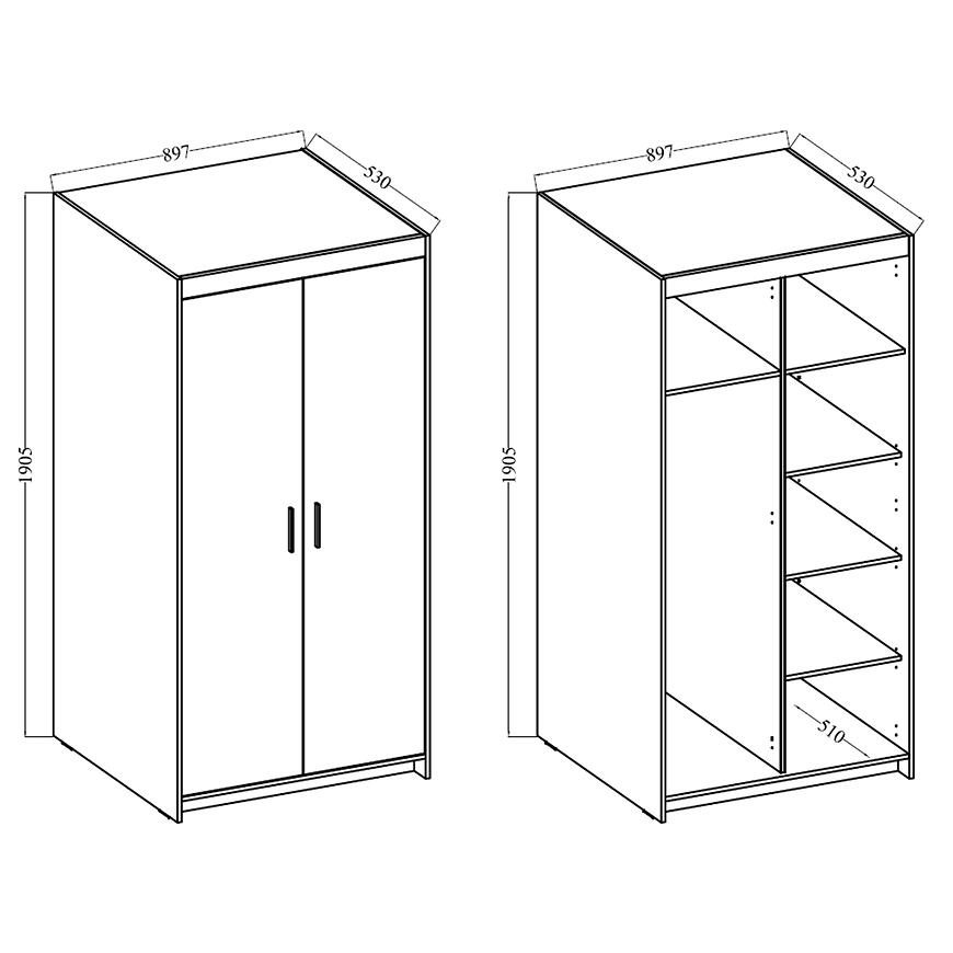 Dzięki wymiarom 89,7 cm szerokości, 190,5 cm wysokości i 53 cm głębokości, szafa Elena 2D sprawdzi się również w pomieszczeniach o ograniczonej powierzchni. To praktyczna szafa dwudrzwiowa bez lustra, zaprojektowana z myślą o codziennym użytkowaniu i uporządkowanym przechowywaniu odzieży.