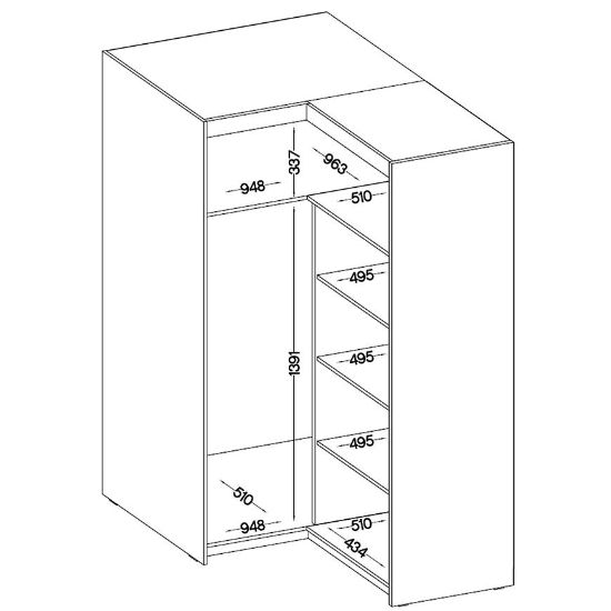 Wnętrze szafy Elena 2D narożnej zapewnia praktyczne rozwiązania do przechowywania. Dzięki dobrze przemyślanej konstrukcji, szafa pozwala na utrzymanie porządku i organizacji w każdym pomieszczeniu. Jej pojemność i funkcjonalność sprawiają, że doskonale sprawdzi się zarówno w mniejszych, jak i większych przestrzeniach.
