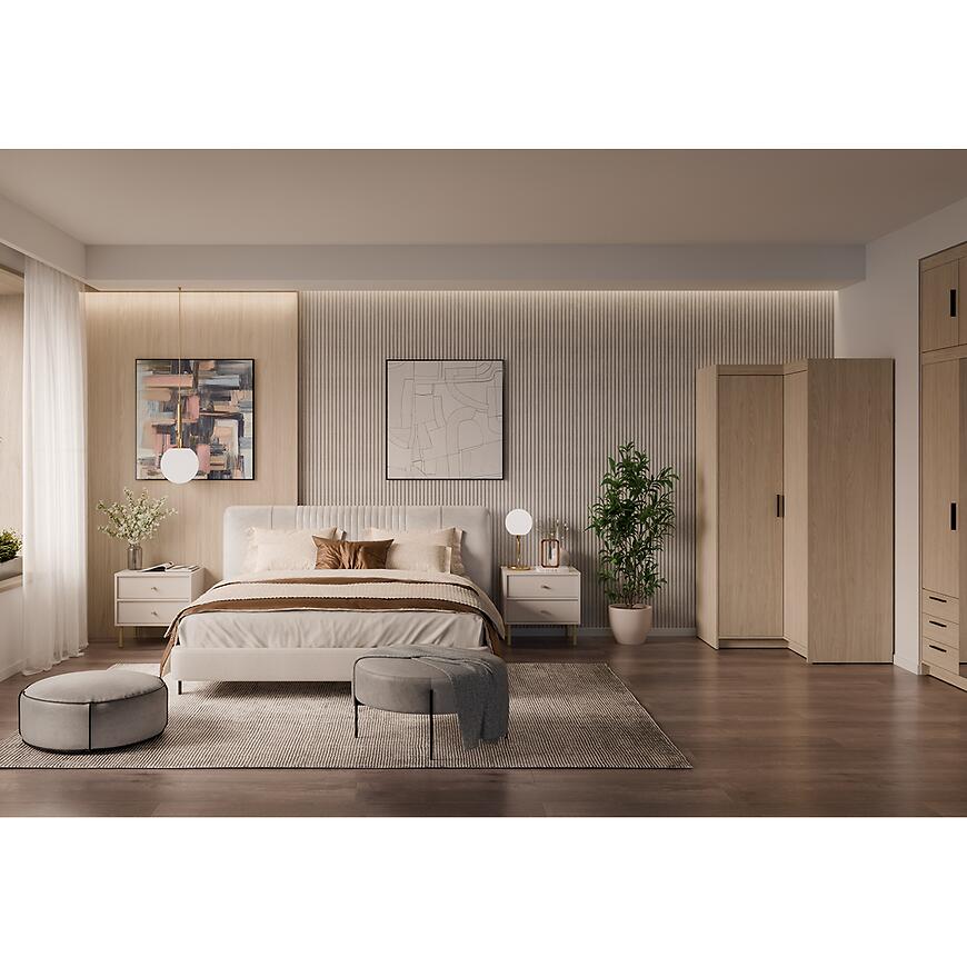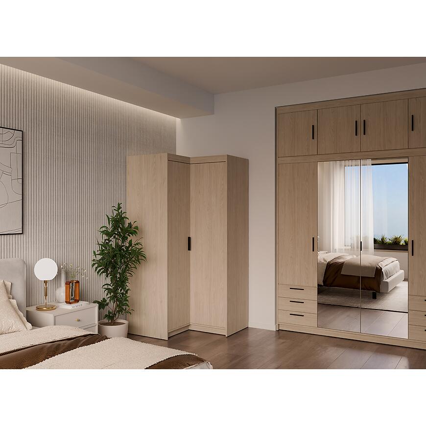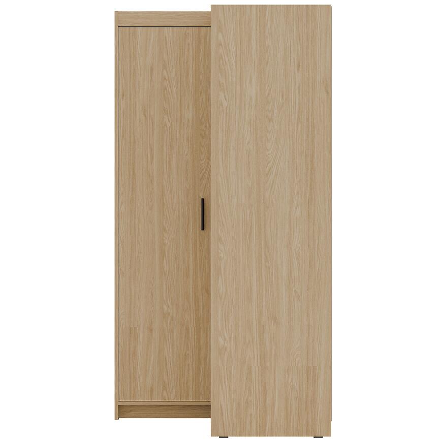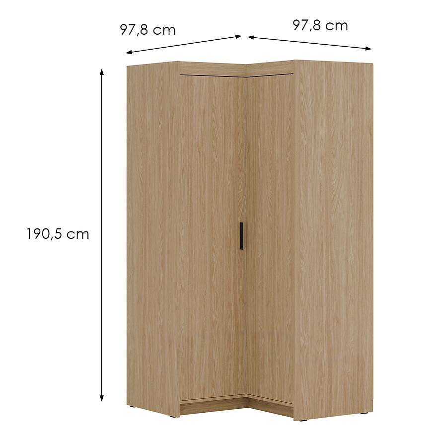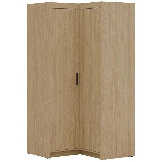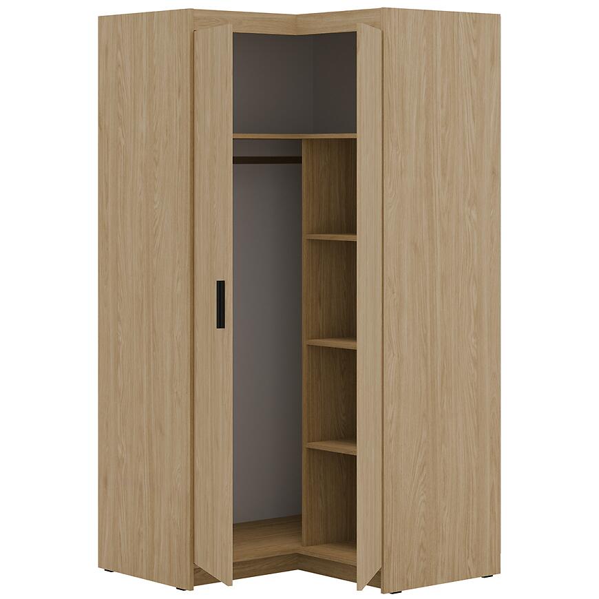 Klasyczne drzwi dwudrzwiowe ułatwiają dostęp do wnętrza szafy, a narożna konstrukcja pozwala na efektywne wykorzystanie przestrzeni, której tradycyjna szafa nie byłaby w stanie zagospodarować. Neutralny, drewnopodobny odcień dębu olejowanego harmonijnie komponuje się z nowoczesnymi aranżacjami wnętrz.