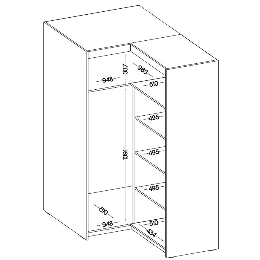 Wnętrze szafy Elena 2D narożnej zapewnia praktyczne rozwiązania do przechowywania. Dzięki dobrze przemyślanej konstrukcji, szafa pozwala na utrzymanie porządku i organizacji w każdym pomieszczeniu. Jej pojemność i funkcjonalność sprawiają, że doskonale sprawdzi się zarówno w mniejszych, jak i większych przestrzeniach.