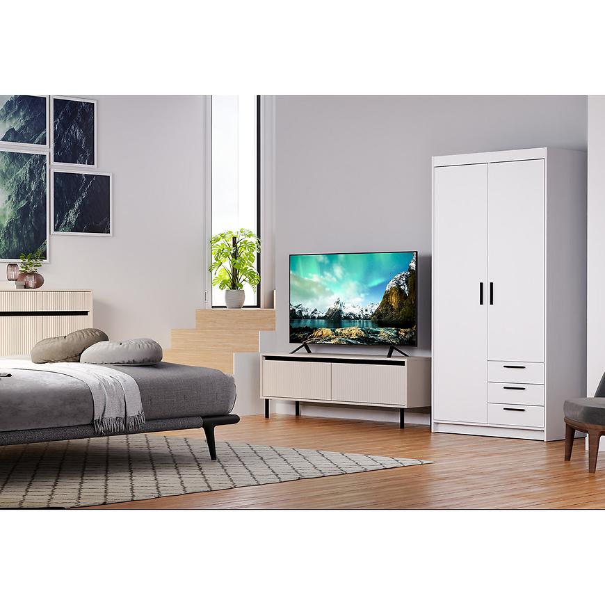 Wykonana z wysokiej jakości płyty wiórowej laminowanej, szafa Elena 2D3S charakteryzuje się wytrzymałością i odpornością na codzienne użytkowanie. Zarówno fronty, jak i korpus wykończone są w matowym odcieniu, co nadaje jej elegancki i nowoczesny wygląd, a jednocześnie sprawia, że mebel łatwo komponuje się z innymi elementami wyposażenia. Prosta, geometryczna forma szafy oraz jej uniwersalna kolorystyka doskonale wpisują się w aktualne trendy wnętrzarskie, podkreślając minimalistyczny styl i elegancję każdego pomieszczenia.
