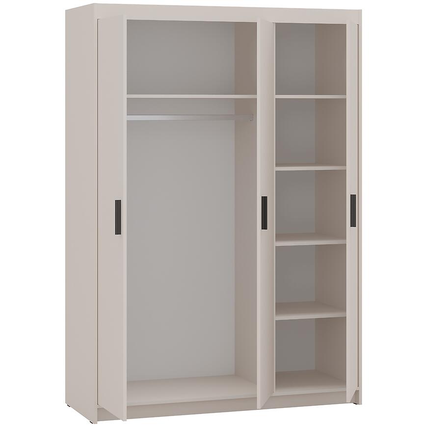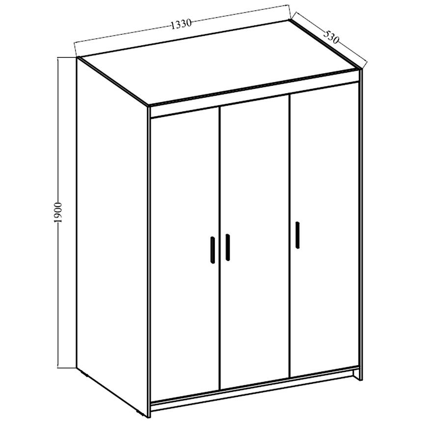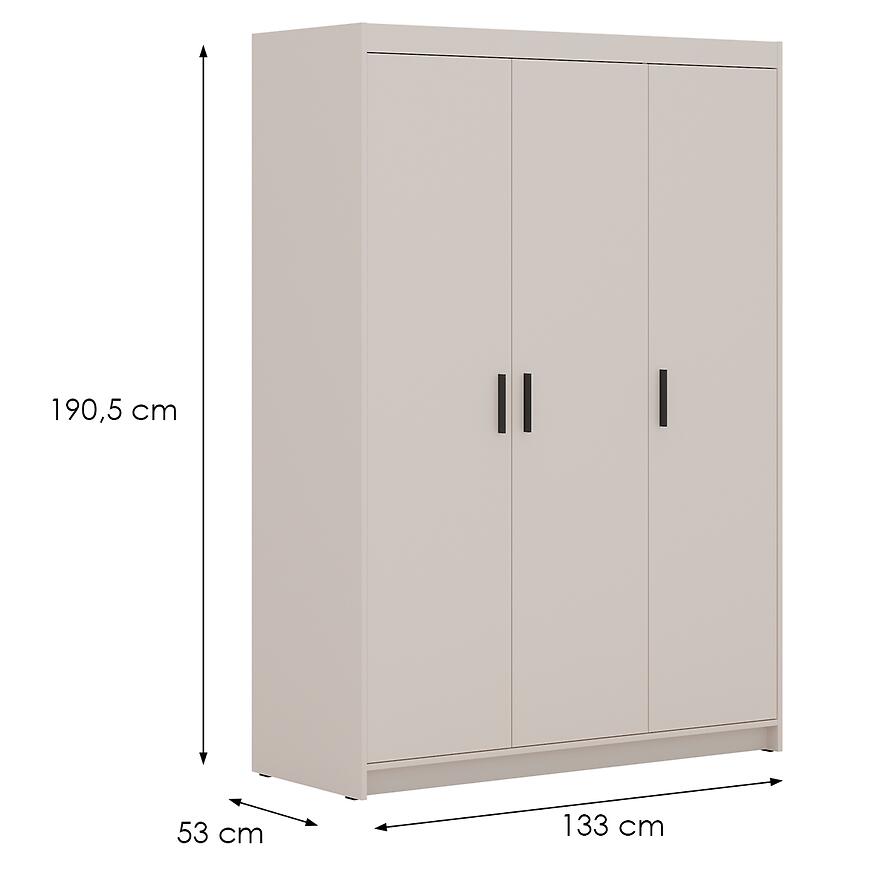Szerokość 133 cm, wysokość 190,5 cm oraz głębokość 53 cm zapewniają komfortowe warunki do przechowywania ubrań, tekstyliów i akcesoriów. Trzydrzwiowa konstrukcja ułatwia organizację wnętrza szafy i umożliwia wygodny dostęp do jej zawartości. Model nie posiada lustra, co pozwala zachować jednolitą bryłę i minimalistyczny charakter mebla.