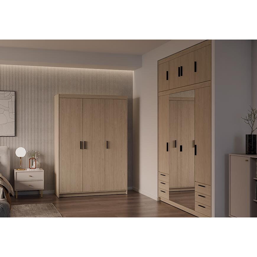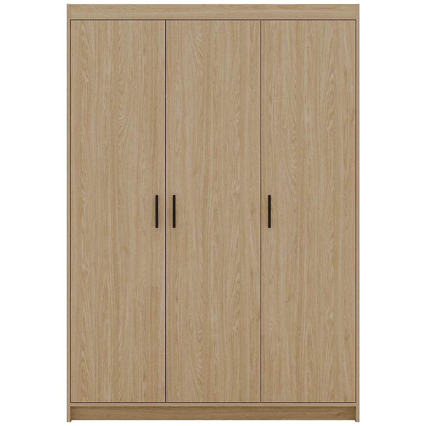 Klasyczne drzwi trzydrzwiowe zapewniają wygodny dostęp do wnętrza szafy, umożliwiając łatwe przechowywanie ubrań i innych przedmiotów codziennego użytku. Neutralny, drewnopodobny odcień dębu olejowanego harmonijnie komponuje się z nowoczesnymi aranżacjami wnętrz.