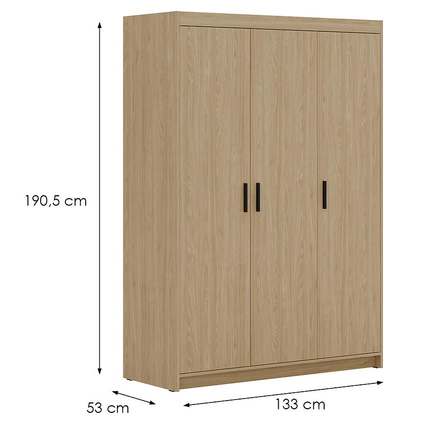 Trzydrzwiowa konstrukcja o szerokości 133 cm, wysokości 190,5 cm i głębokości 53 cm oferuje dużą przestrzeń do przechowywania ubrań, pościeli i tekstyliów. Szafa Elena 3D dąb olejowany to idealne rozwiązanie dla osób, które potrzebują funkcjonalnego i estetycznego mebla do nowoczesnego wnętrza.