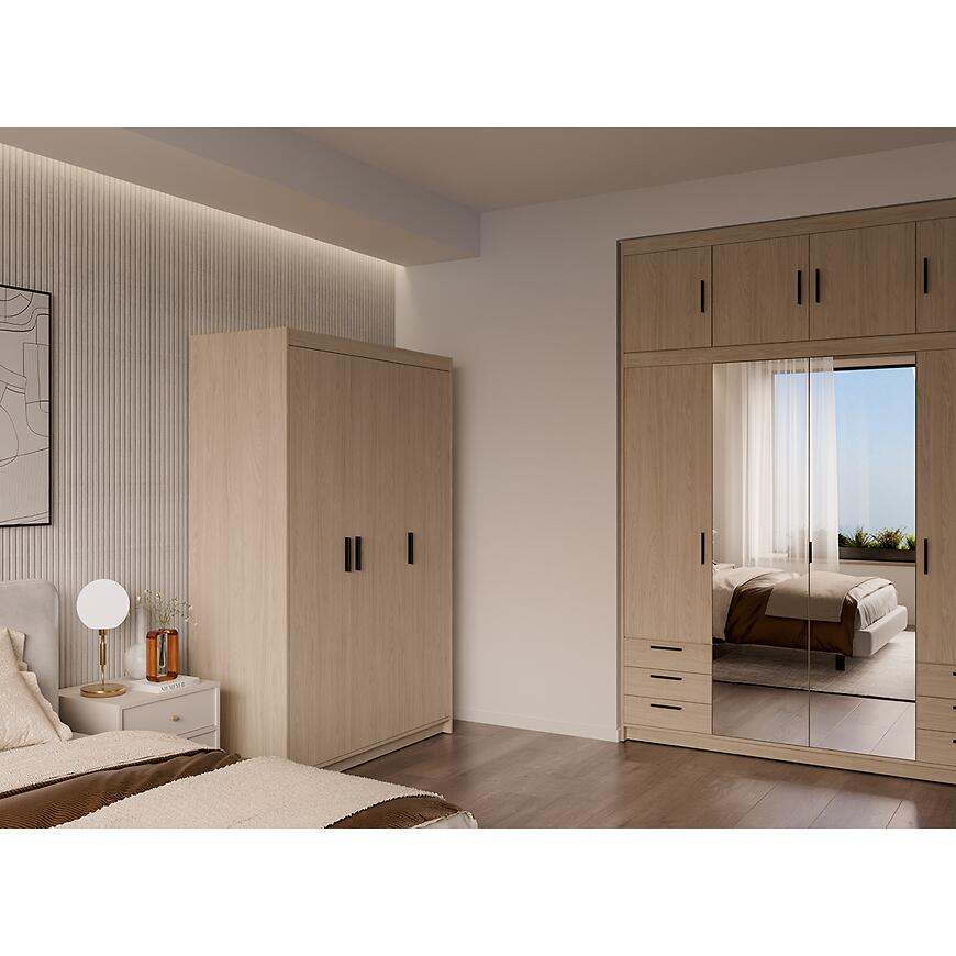 Szafa Elena 3D w kolorze dąb olejowany łączy nowoczesny design z pojemnym wnętrzem do przechowywania. Prosta forma i matowe wykończenie frontów nadają meblowi lekkości i elegancji, a ciepły, drewnopodobny odcień wprowadza naturalny, przytulny akcent do sypialni, garderoby lub przedpokoju.