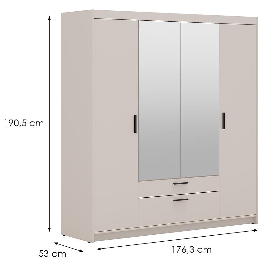 Dzięki szerokości 176,3 cm, wysokości 190,5 cm i głębokości 53 cm, szafa Elena 4D 2S oferuje dużą przestrzeń do przechowywania ubrań, pościeli i akcesoriów. Kilkudrzwiowa konstrukcja w połączeniu z dwiema szufladami pozwala na wygodną organizację wnętrza, a wbudowane lustro na froncie zwiększa funkcjonalność mebla i optycznie powiększa przestrzeń, co jest szczególnie przydatne w większych i mniejszych pokojach.