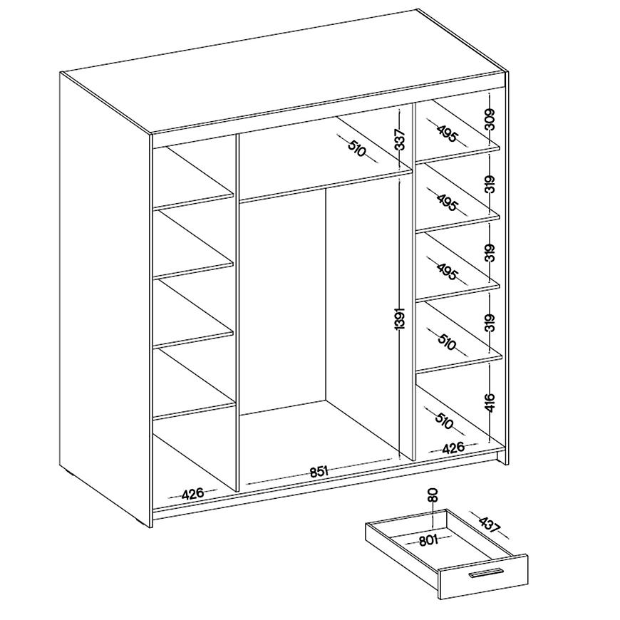 Wnętrze szafy jest przemyślane i funkcjonalne. Dodatkowo, szafa Elena 4D 6S wyposażona jest w sześć praktycznych szuflad, które stanowią idealne miejsce na drobniejsze przedmioty, takie jak bielizna czy dodatki. Dzięki tak dużej pojemności, szafa ta doskonale sprawdzi się zarówno w sypialni, jak i w garderobie, oferując optymalną ilość miejsca na różnorodne elementy garderoby.