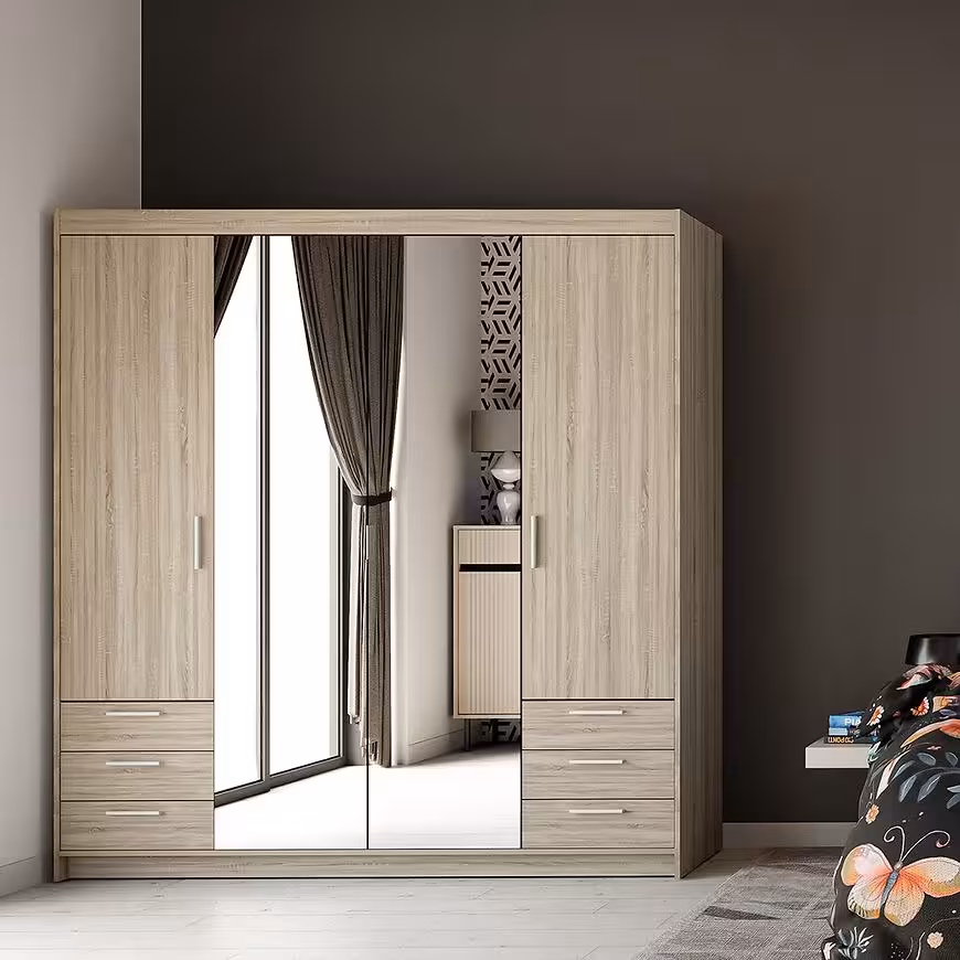 Szafa Elena 4D 6S z lustrem to przestronny i funkcjonalny mebel, który doskonale sprawdzi się w nowoczesnych wnętrzach. Jej wymiary czynią ją idealnym wyborem dla osób poszukujących dużej przestrzeni do przechowywania. Czterodrzwiowa konstrukcja z klasycznymi drzwiami zapewnia łatwy dostęp do wnętrza szafy, a umieszczone na frontach lustro dodaje elegancji, jednocześnie optycznie powiększając pomieszczenie. To rozwiązanie sprawia, że szafa staje się zarówno funkcjonalnym, jak i estetycznym elementem wyposażenia wnętrza.