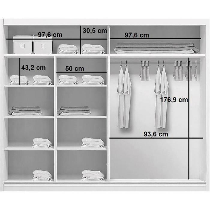 Szafa z drzwiami przesuwnymi Elena to doskonały wybór do garderoby, przedpokoju, salonu czy sypialni. Kolor frontów i korpusu sprawiają, że wpasuje się w większość aranżacji. Jej wnętrze jest pojemne i pomieści zarówno ubrania jak i inne akcesoria. Szafa jest 2-drzwiowa oraz posiada lustro, które optycznie powiększy pomieszczenie.