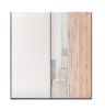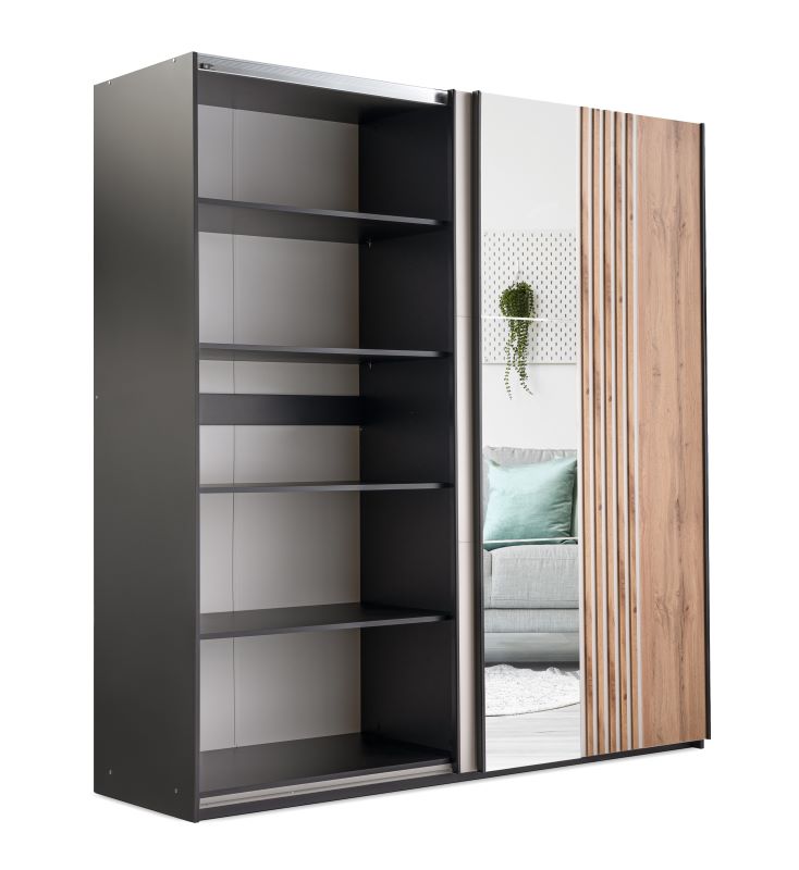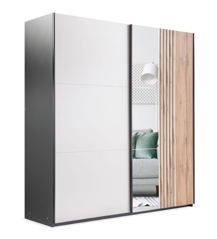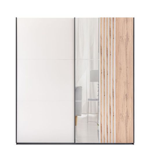 Szafa EVORA 203 to nowoczesny i stylowy mebel, który doskonale łączy funkcjonalność z estetyką. Ta 2-drzwiowa szafa przesuwna wyróżnia się eleganckim frontem w unikalnym, dwukolorowym wykończeniu. Część frontu pokryta jest lustrem, które optycznie powiększa przestrzeń, a dębowe lamele na kaszmirowej płycie dodają ciepłego, naturalnego akcentu. Korpus szafy został wykonany w kontrastującym czarnym kolorze, co nadaje całości nowoczesnego i wyrafinowanego charakteru.