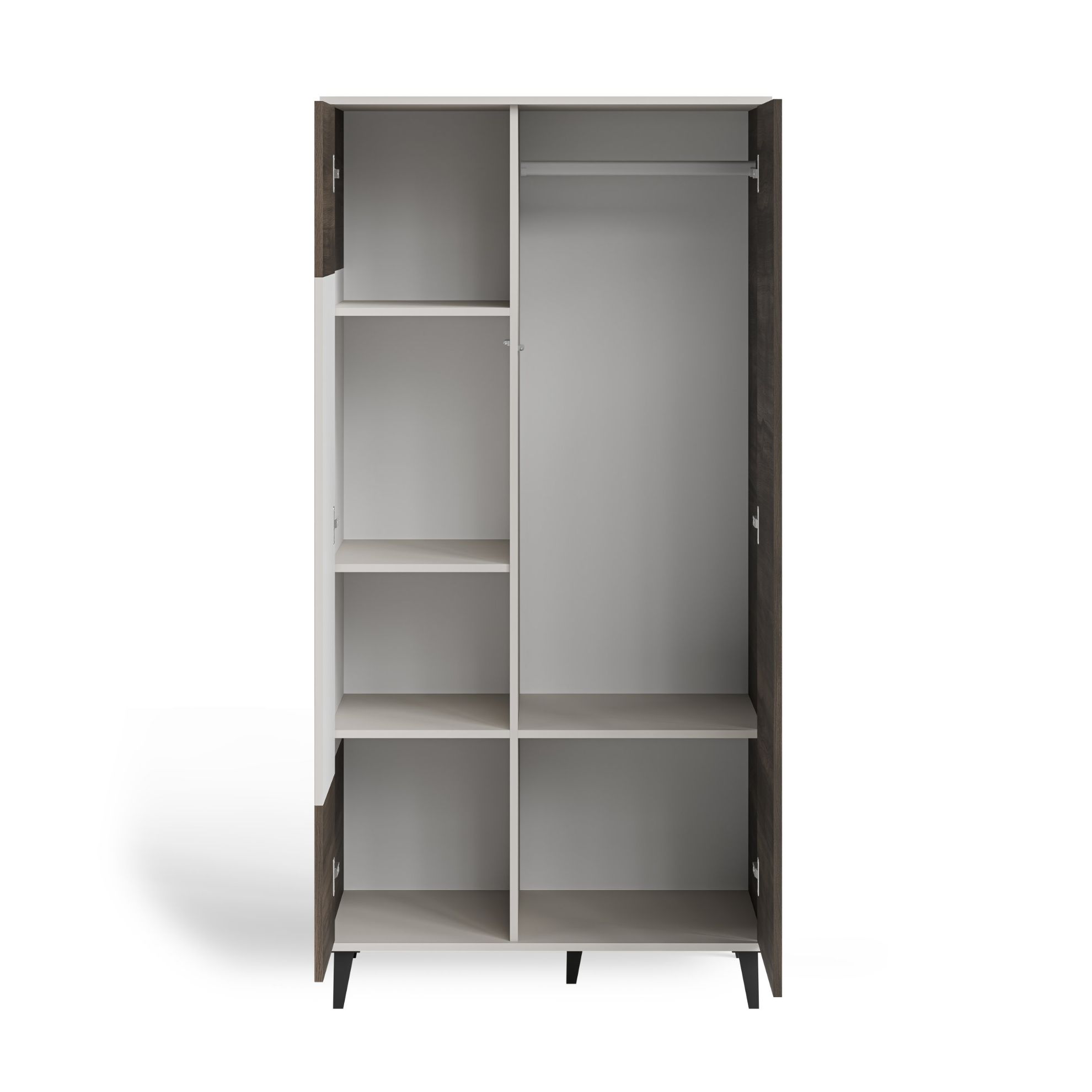 Zastosowanie nóżek nadaje meblowi nowoczesny wygląd oraz poprawia cyrkulację powietrza pod szafą. Dzięki temu rozwiązaniu szafa kaszmir/orzech/czarny prezentuje się lekko i harmonijnie, a jednocześnie zachowuje stabilność konstrukcji. Podwyższona forma ułatwia również sprzątanie przy użyciu odkurzacza lub robota sprzątającego, co zwiększa komfort codziennego użytkowania.