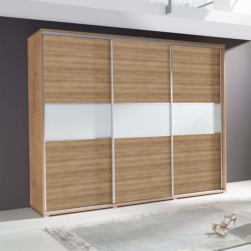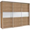 Konstrukcja szafy opiera się na płycie wiórowej laminowanej, co gwarantuje trwałość i stabilność mebla. Dąb riviera dodaje wnętrzu ciepła, podkreślając jednocześnie subtelną klasę. Białe szklane drzwi sprawiają, że szafa prezentuje się lekko i nowocześnie, dodając przestrzeni elegancji.