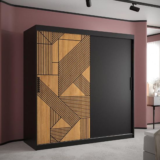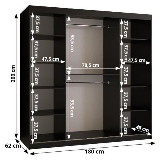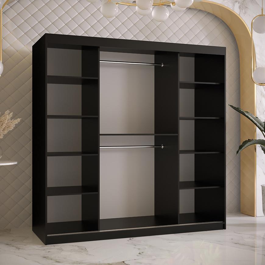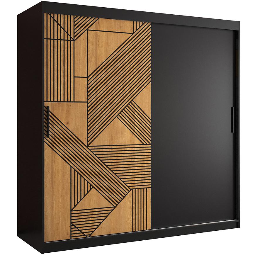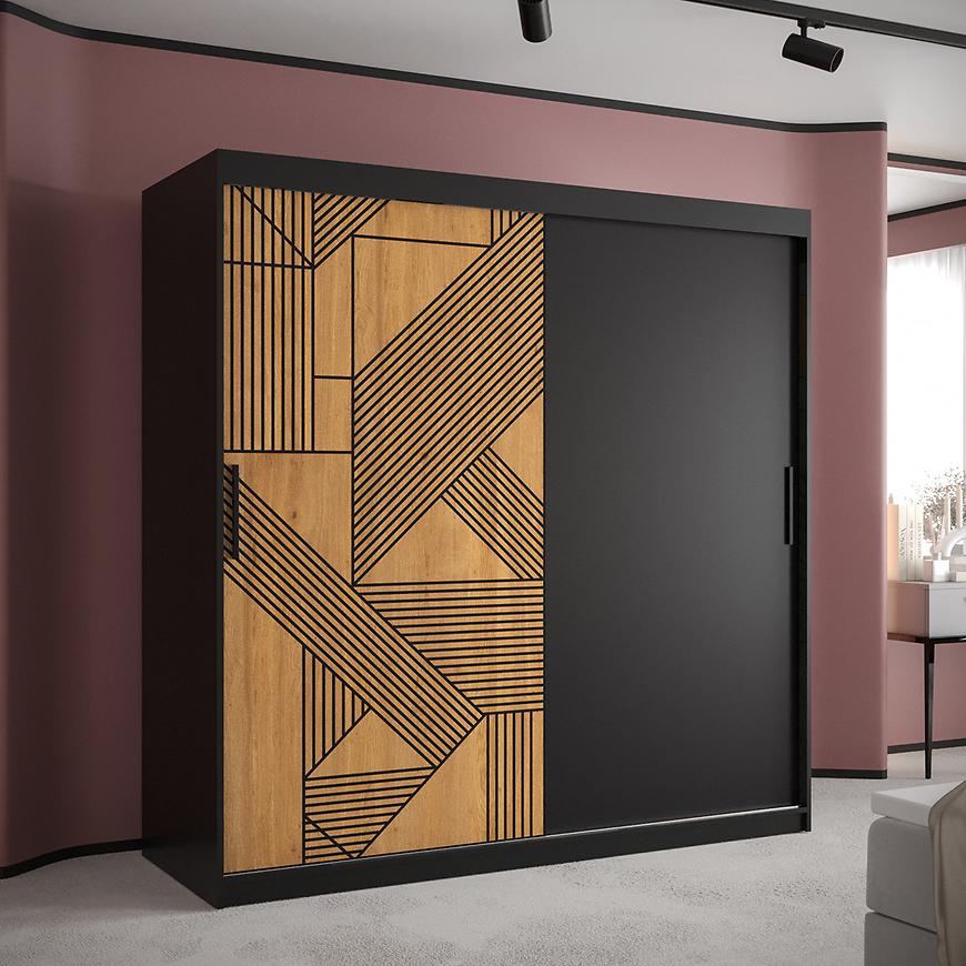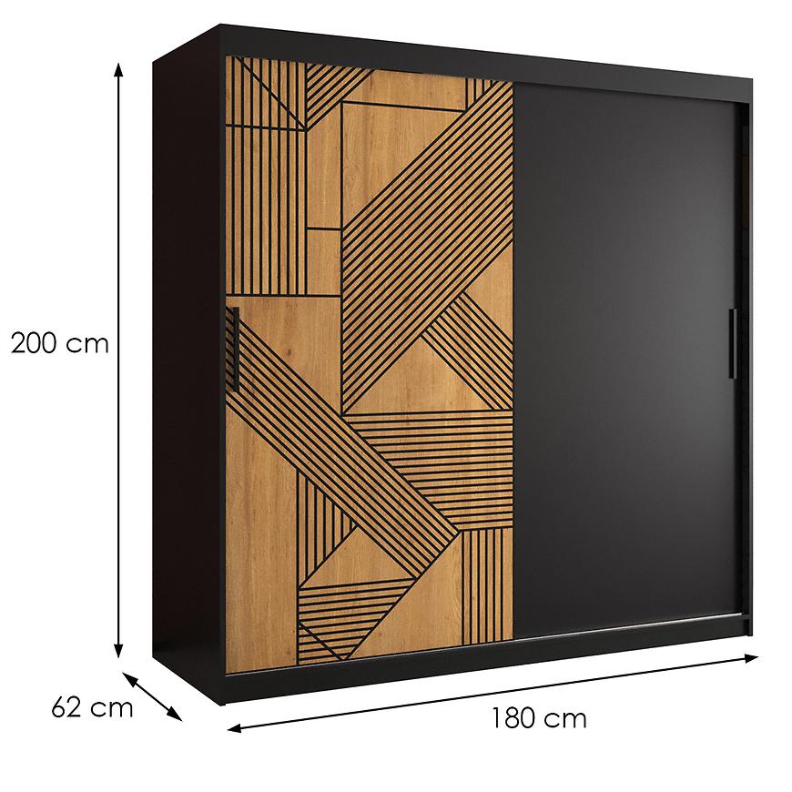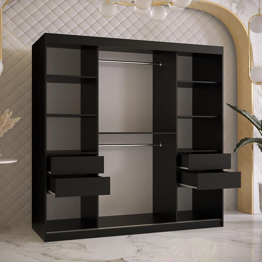 Czarne matowe fronty drzwi w połączeniu z jesionem jasnym tworzą kontrastowy, stylowy wygląd, który doskonale komponuje się z nowoczesnymi aranżacjami wnętrz. Czarny matowy korpus szafy dodaje elegancji i podkreśla minimalistyczny charakter mebla. Konstrukcja frontów i korpusu oparta jest na solidnej płycie wiórowej laminowanej, co gwarantuje trwałość i stabilność mebla. Matowe wykończenie dodaje subtelności, tworząc jednolitą, stonowaną estetykę.