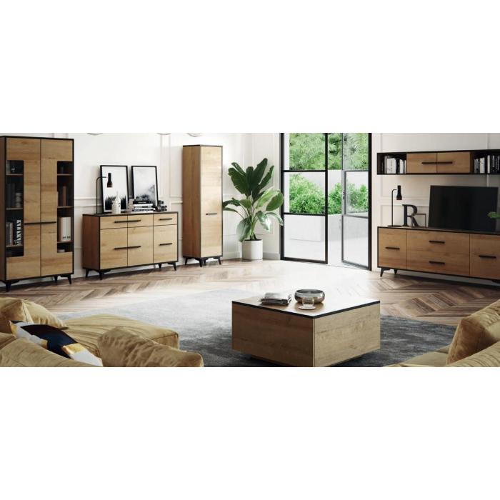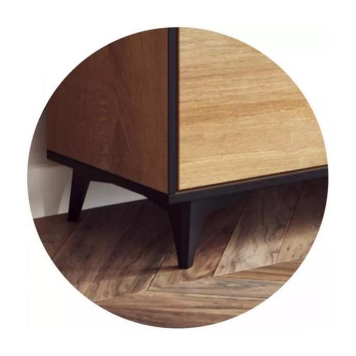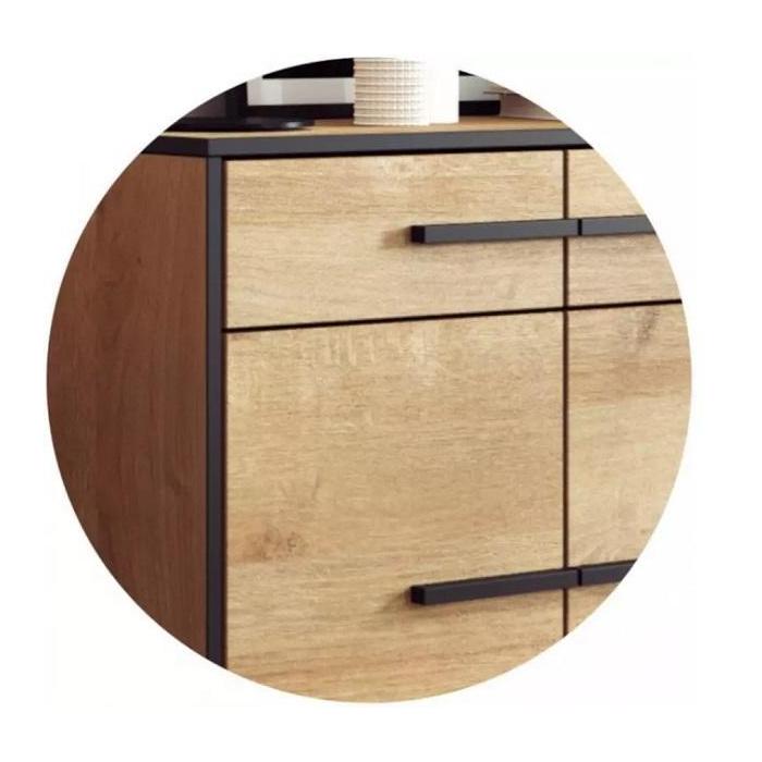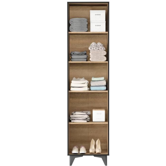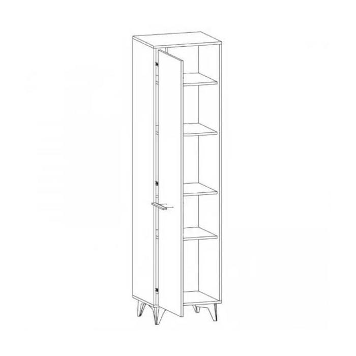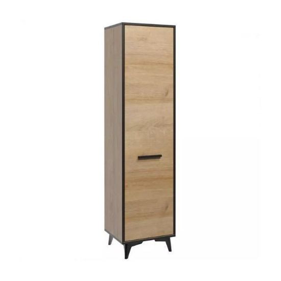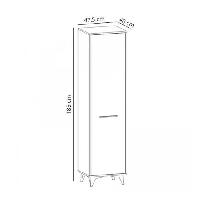 Szafa w środku posiada 4 półki. Wysokość nóżki 12 cm. Szafa wykonana z płyty laminowanej, odporna na uszkodzenia, krawędzie wykończone w kolorze czarnym. Uchwyty i nóżki w kolorze czarnym wykonane z tworzywa sztucznego. Do samodzielnego montażu.