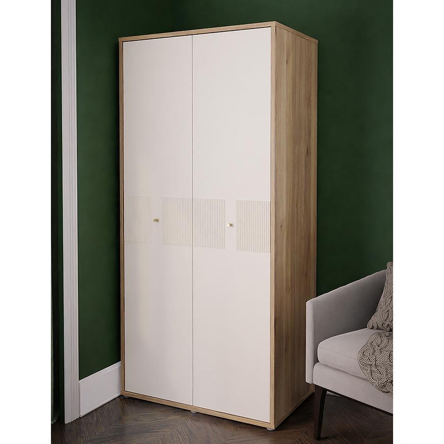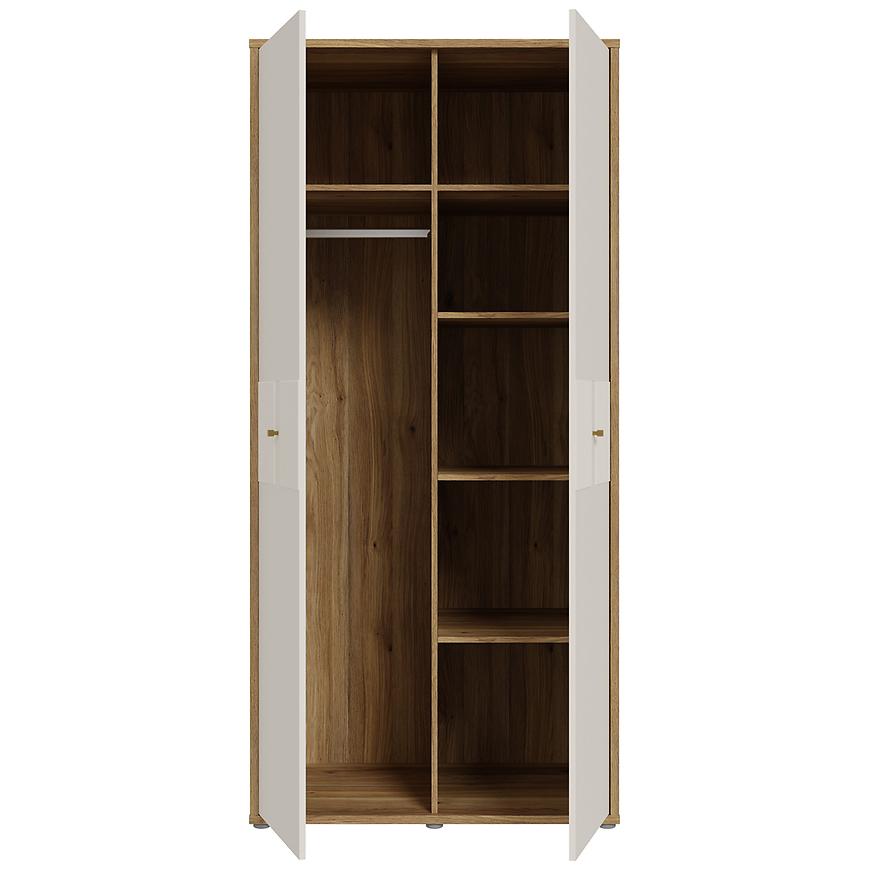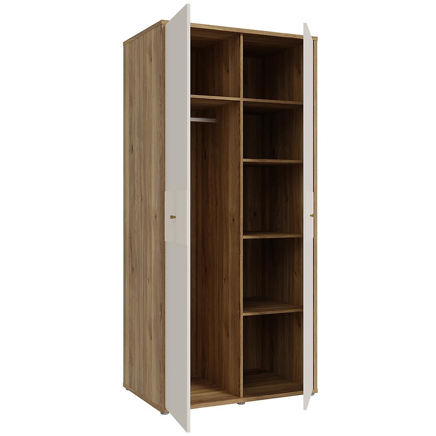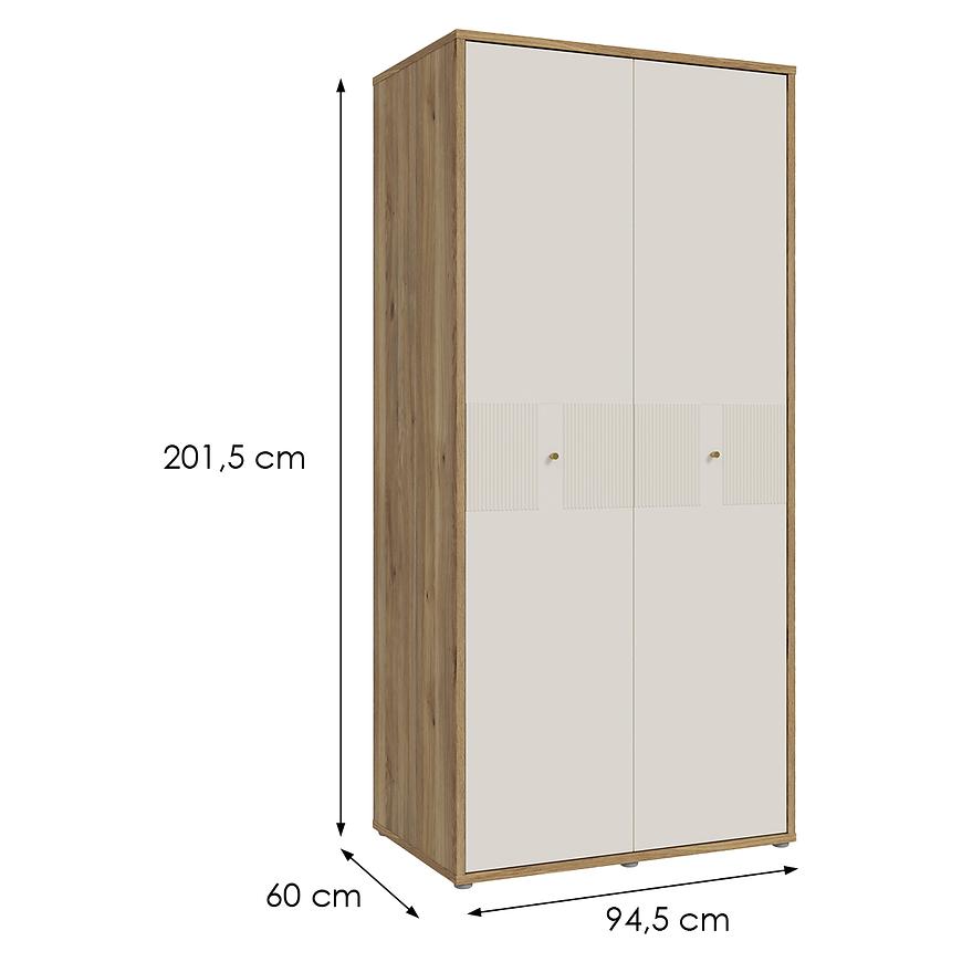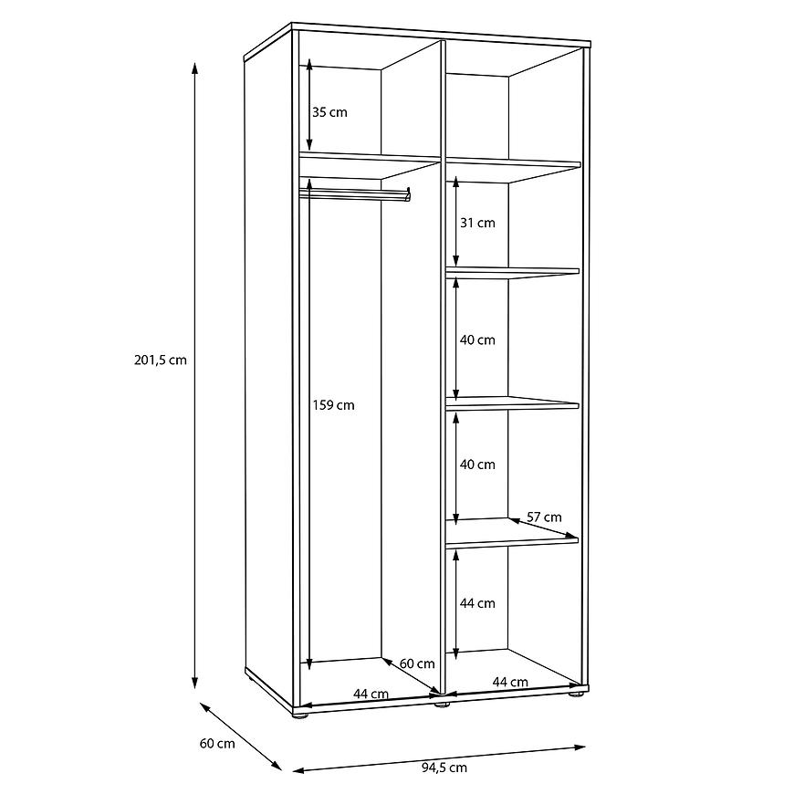 Szafa została wykonana z wysokiej jakości płyty wiórowej laminowanej, co zapewnia jej solidność, trwałość i odporność na codzienne użytkowanie. Dwudrzwiowa konstrukcja z klasycznym systemem otwierania drzwi ułatwia dostęp do całej zawartości szafy, co jest praktycznym rozwiązaniem w codziennym użytkowaniu. Wnętrze szafy można łatwo zorganizować, dopasowując je do indywidualnych potrzeb – od przechowywania ubrań na wieszakach po inne przedmioty, które można wygodnie posegregować na półkach.