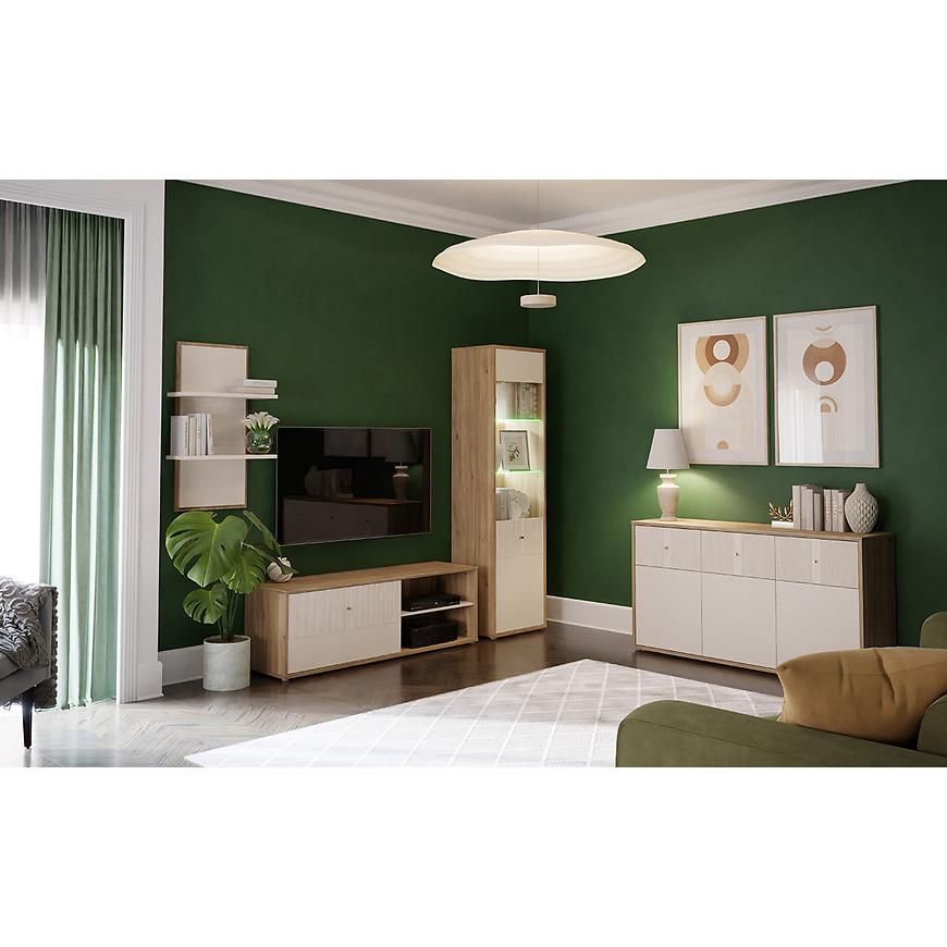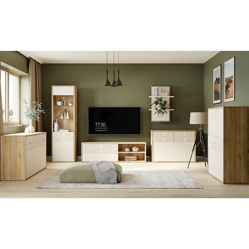 Jej wybarwienie w jasnym drewnopodobnym odcieniu dębu Mauvella idealnie harmonizuje z kontrastowymi, piaskowymi akcentami na frontach, tworząc elegancką i modną kompozycję kolorystyczną. Matowe wykończenie frontów i korpusu dodaje subtelności i wyrafinowania, sprawiając, że mebel idealnie sprawdzi się zarówno w nowoczesnych, minimalistycznych wnętrzach, jak i tych urządzonych w bardziej klasycznym stylu.