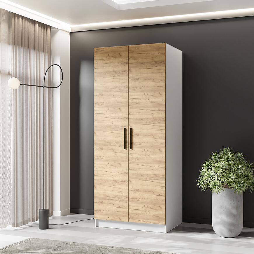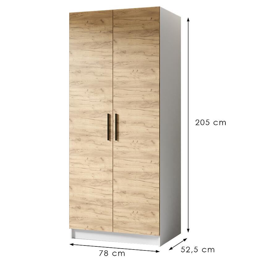 Szafa Gold 2d Biały/Dąb Craft Złoty to nowoczesny i elegancki mebel, łączący funkcjonalność z atrakcyjnym designem. Posiada dwudrzwiową konstrukcję z klasycznymi drzwiami, oferując wygodną przestrzeń do przechowywania ubrań i dodatków. Wykonana z laminowanej płyty wiórowej, z frontami w odcieniu dąb craft złoty i korpusem w białym macie, łączy trwałość z estetyką. Dzięki wymiarom 78 × 205 × 52,5 cm jest praktyczna i jednocześnie zajmuje niewiele miejsca, idealnie wpisując się w nowoczesne aranżacje wnętrz.