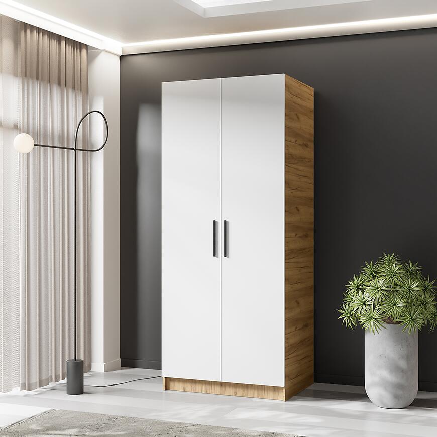 Szafa Gold 2d Dąb Craft Złoty/Biały to nowoczesny i funkcjonalny mebel, łączący elegancję z praktycznym designem. Posiada dwudrzwiową konstrukcję z klasycznymi drzwiami, oferując wygodną przestrzeń do przechowywania ubrań i dodatków. Wykonana z laminowanej płyty wiórowej, z frontami w białym macie i korpusem w odcieniu dąb craft złoty, łączy trwałość z estetyką. Dzięki wymiarom 78 × 205 × 52,5 cm jest praktyczna, kompaktowa i doskonale wpisuje się w nowoczesne aranżacje wnętrz.